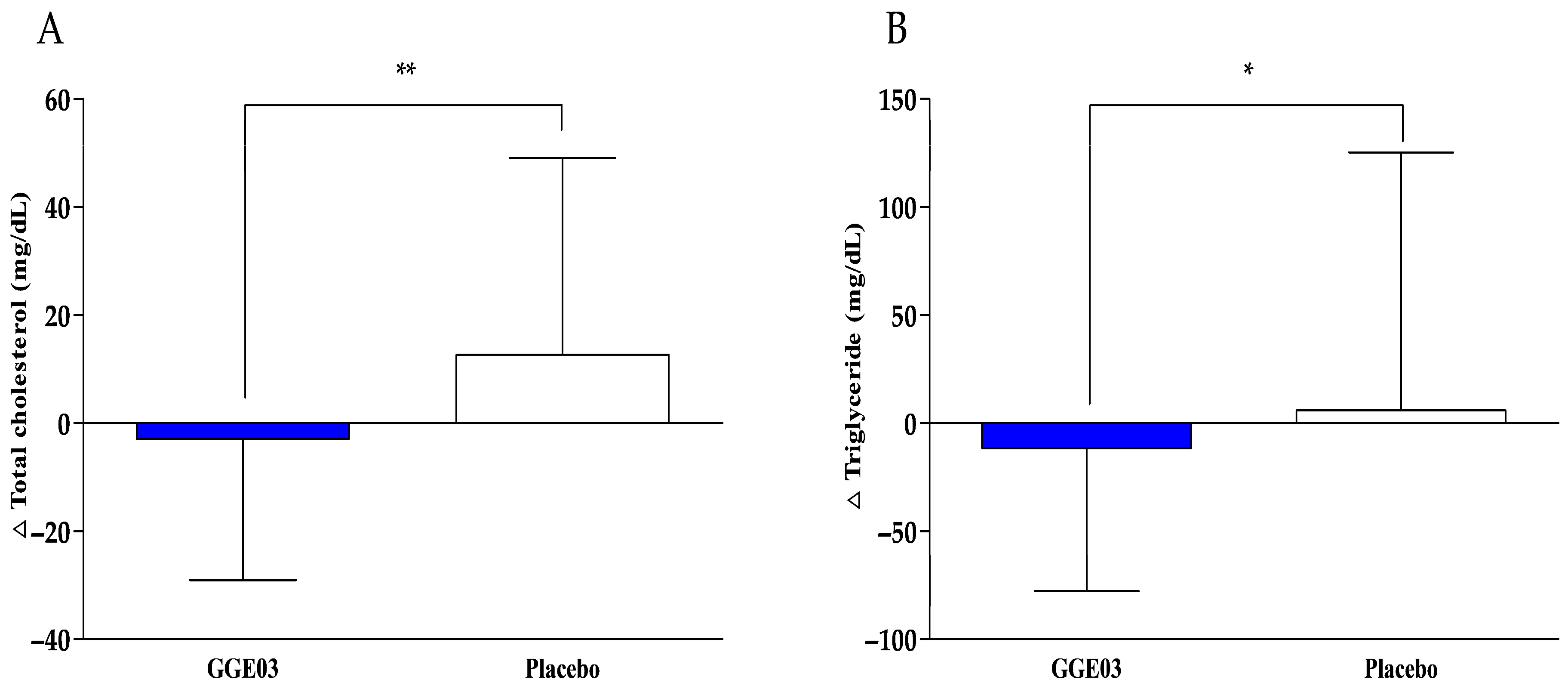 | Total cholesterol (mg/dL) | 172.22 ± 24.85 | 169.28 ± 33.60 | −2.94 ± 26.18 | 0.050 2 | 175.08 ± 34.35 | 187.70 ± 36.04 | 12.62 ± 36.35 | 0.042 | 0.007 ** |