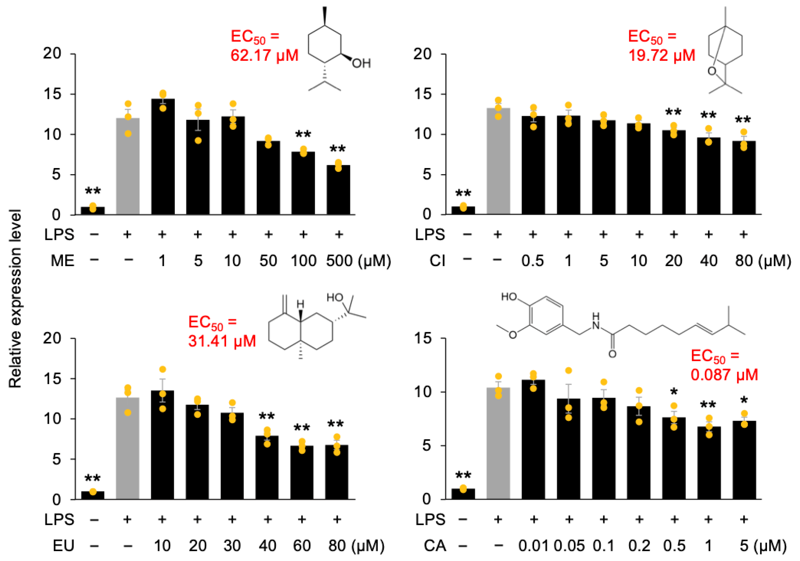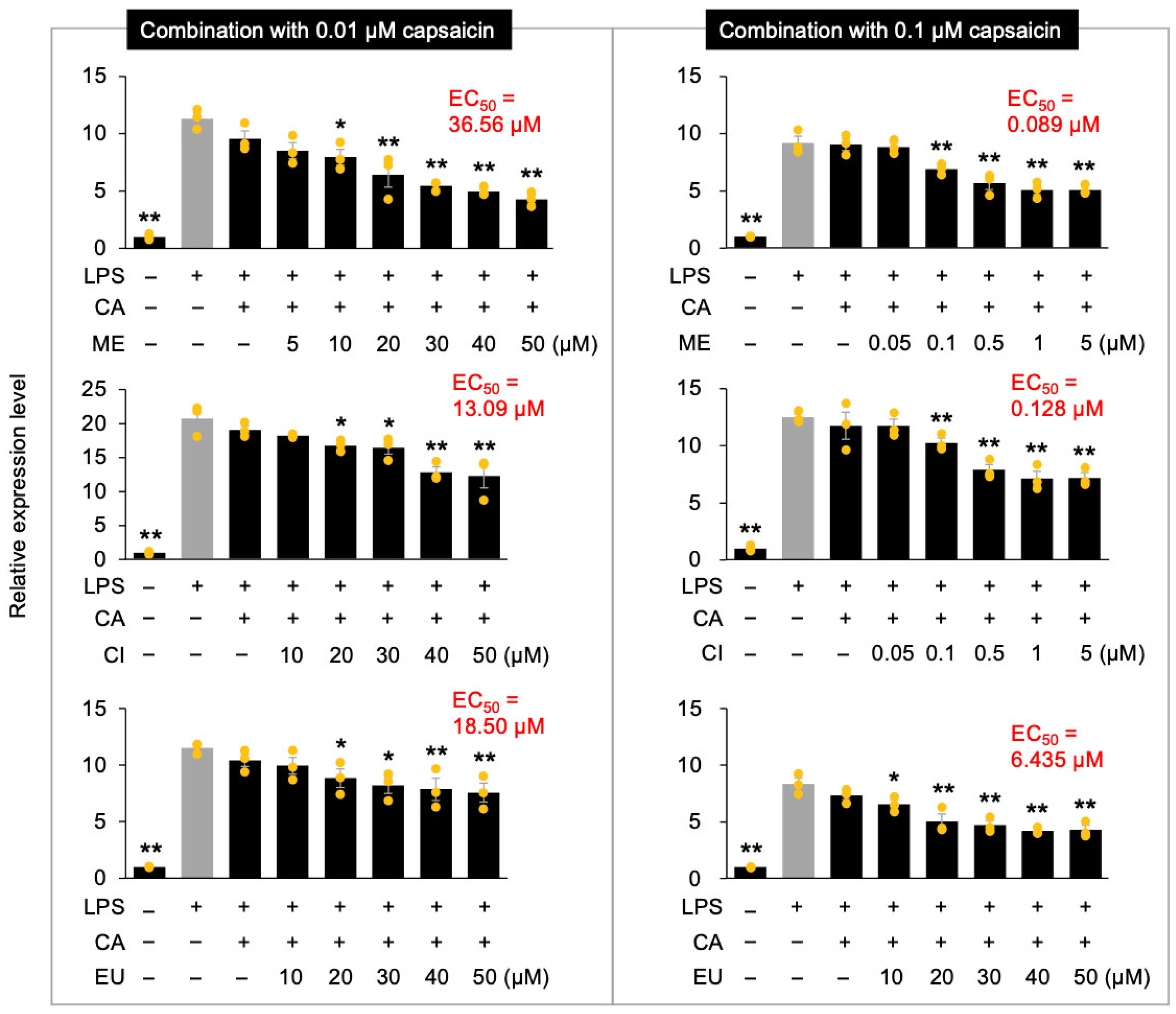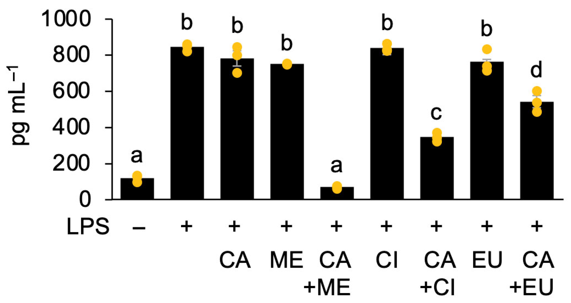 In this study, we evaluated the anti-inflammatory activities of the phytochemicals ME, CI, EU, and CA by assessing their ability to suppress LPS-induced