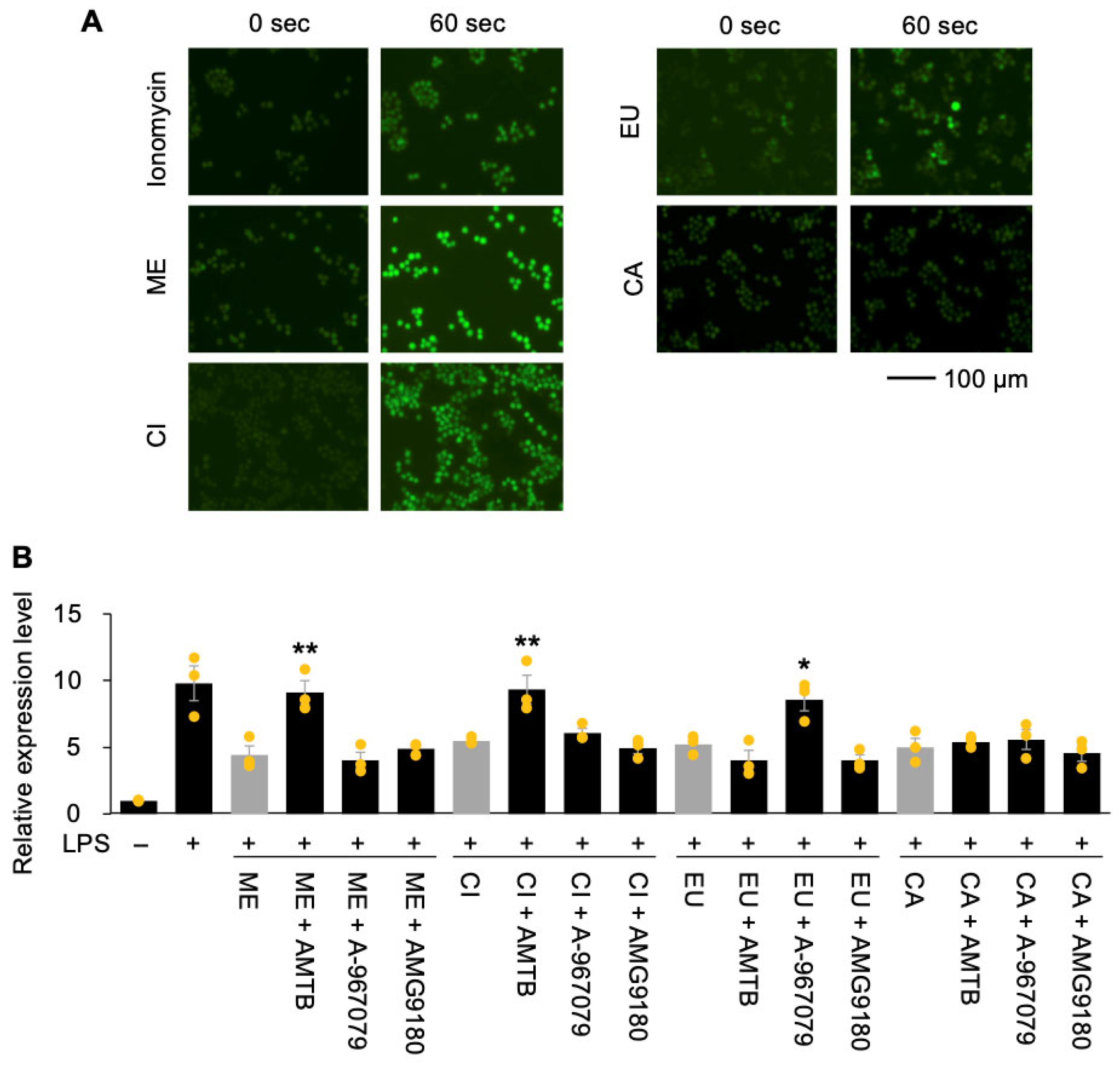 To assess the effect of lipopolysaccharide (LPS) stimulation, cells were incubated with or without 1 μg/mL LPS (Sigma-Aldrich, St. Louis, MO, USA) in culture medium for 1, 3, or 6 h. A series of inhibitors/antagonists were applied, including N-(3-Aminopropyl)-2-[(3-methylphenyl)methoxy]-N-(2-thienylmethyl)benzamide (AMTB) hydrochloride (7.5 µM; FUJIFILM Wako Pure Chemical Corporation), a TRPM8 channel inhibitor; A-967079 (20 µM; FUJIFILM Wako Pure Chemical Corporation), a TRPA1 channel inhibitor; and AMG9810 (10 µM; FUJIFILM Wako Pure Chemical Corporation), a TRPV1 channel inhibitor. These compounds were added 2 h prior to the application of phytochemicals. A no-additive control group treated with culture medium alone was included in all experiments.