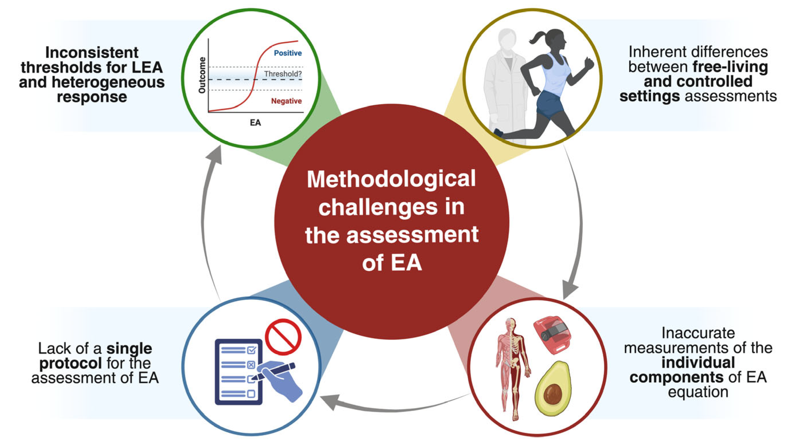 | EA equation and interpretation | EA = (EI − EEE)/FFM (kcal·kg−1·FFM·day−1). | Derived from laboratory-controlled studies and sedentary women; not validated in free-living athletic settings; inconsistent threshold for determining LEA. | Use as a conceptual tool, not a diagnostic cut-off value; interpret alongside physiological markers (leptin, T3, estrogen, RMR); use a battery of validated questionnaires to complement physiological and nutritional assessments. | [29,154] |