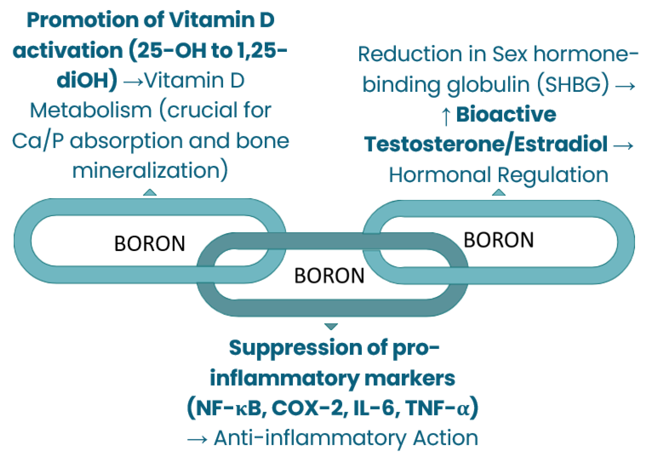 | Boron (B) | Vitamin D Metabolism, Hormonal Regulation, Anti-inflammatory Action, Neuroprotective | Promotes Vitamin D activation Reduces SHBG (Sex Hormone-Binding Globulin). Suppression of NF-kappa B and COX-2 inflammatory markers. Prevention, regulation, or treatment of neurodegeneration and of the onset and progression of Alzheimer’s disease. | Moderate: Supported by controlled trials for inflammation and hormonal metabolism. Suffers from small sample size and heterogeneous endpoints. | [2,4,10,57,59] |