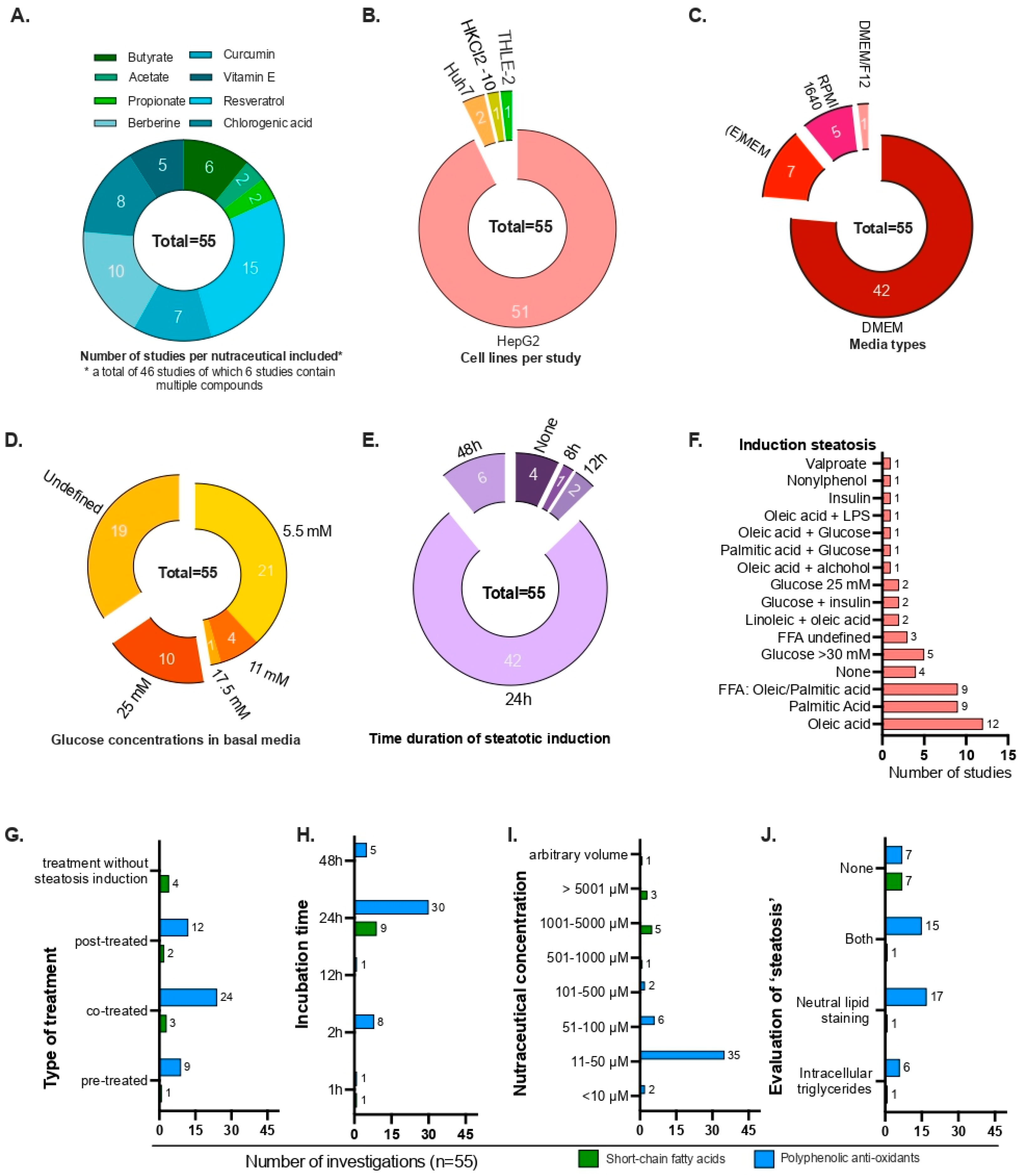 | HepG2 cultured in 0.1% gelatin-coating on DMEM (undefined glucose concentration) and stimulated with 0.4 mM FFAs for 24 h–48 h | Co-treatment of 24 h with 125, 250 or 500 μM chlorogenic acid | Lipid peroxidation (Liperfluo) and neutral lipid IF staining (SRfluor680), LC-MS analysis | [57] | ||