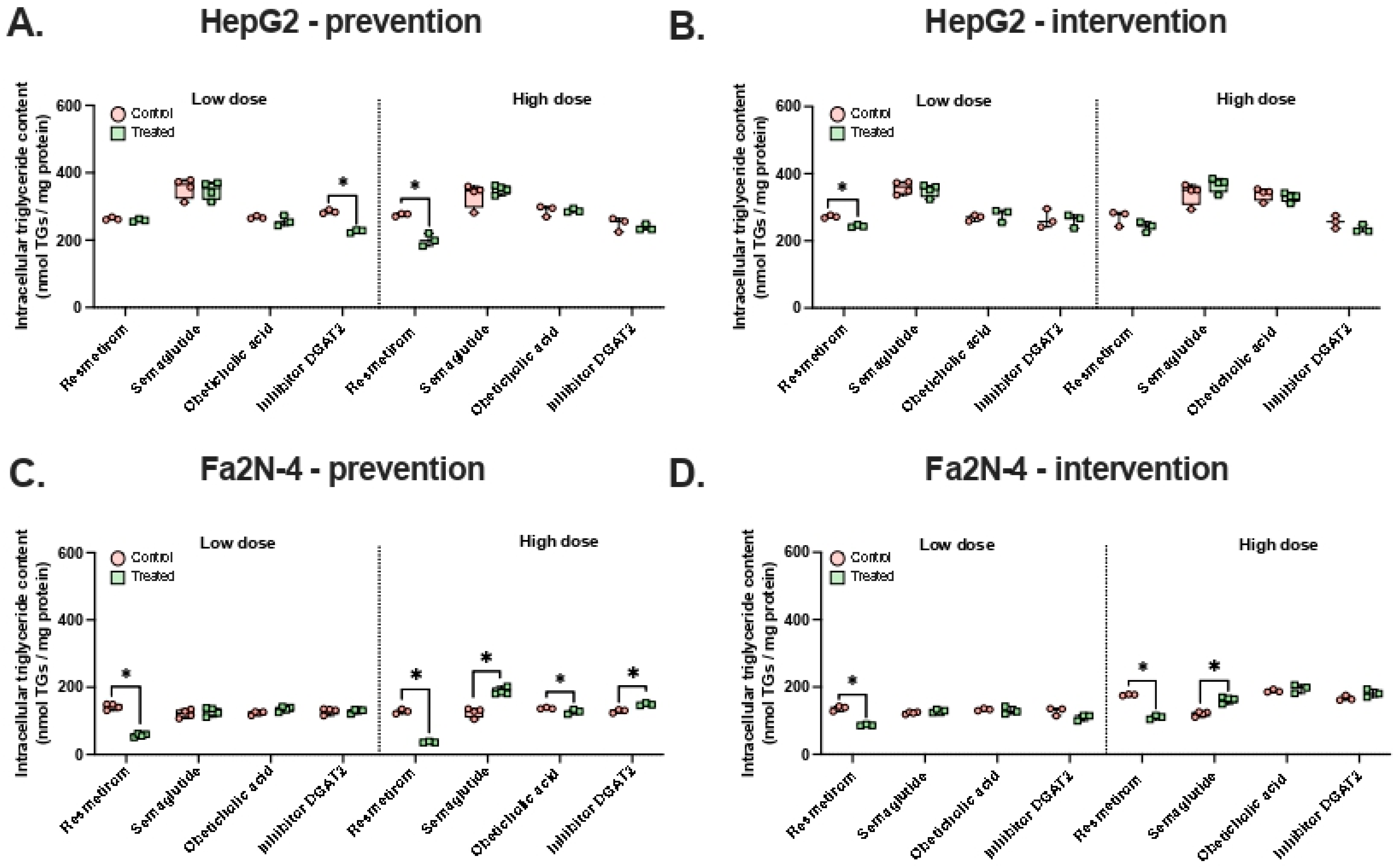 | HepG2 cultured in DMEM (undefined glucose concentration) and treated with 1 mM oleic acid for 24 h | Co-treatment with 100 µM resveratrol for 24 h | Neutral lipid staining (Oil Red O), intracellular triglyceride concentration | [36] | ||