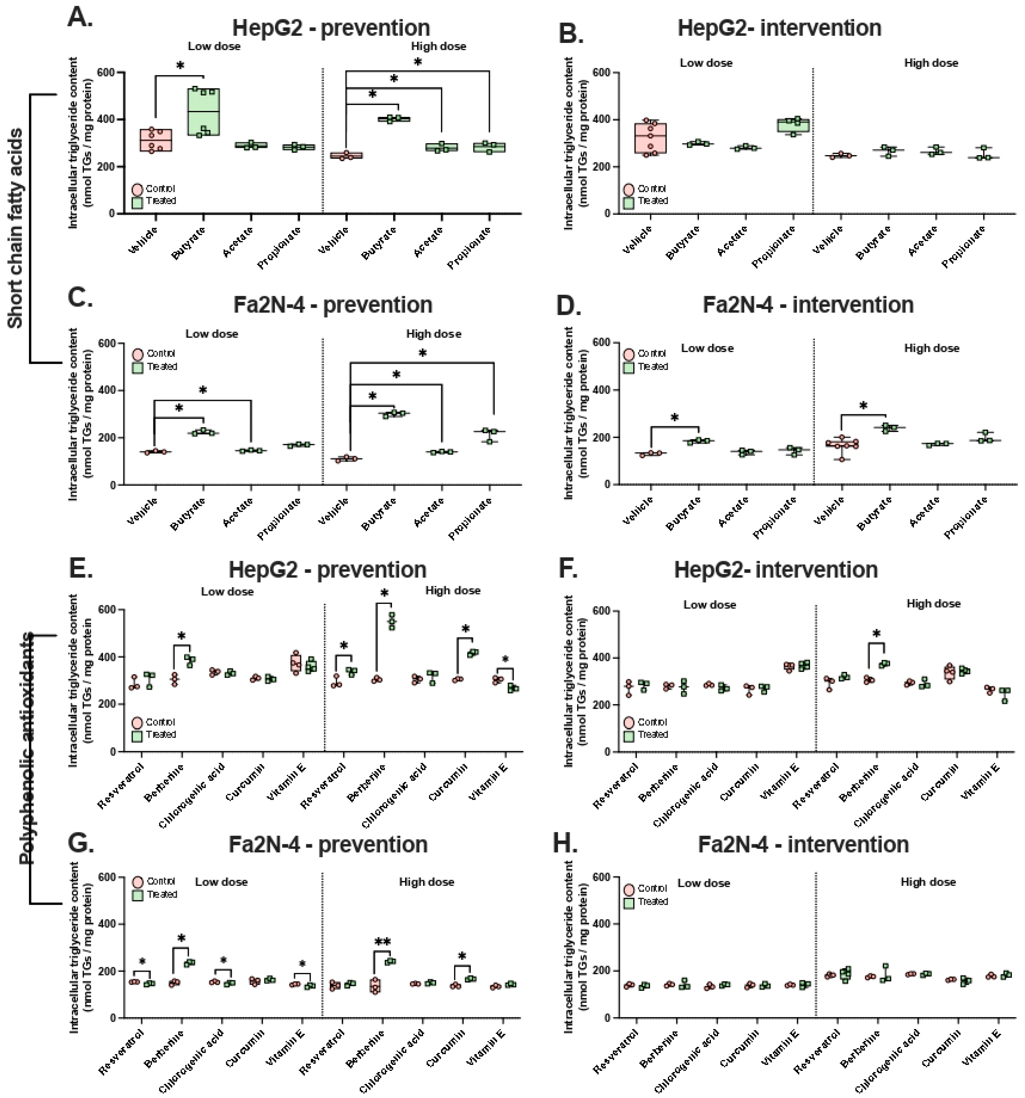 | HepG2 cultured in RPMI 1640 (5.5 mM, 1 g/L glucose), partial serum-starvation (2%) for 6 h and treated with 2 mM valproate (anti-epileptic drug) for 48 h | Pre-treatment for 1 h with 0.5 or 1 mM butyrate | Antioxidant assay (DCFH), lipid peroxidation (malondialdehyde concentration), Western blot, neutral lipid staining (Oil Red O), mitochondrial function (SOD, CPT, aconitase activity), cellular oxygen consumption (Seahorse) | [31] | ||
