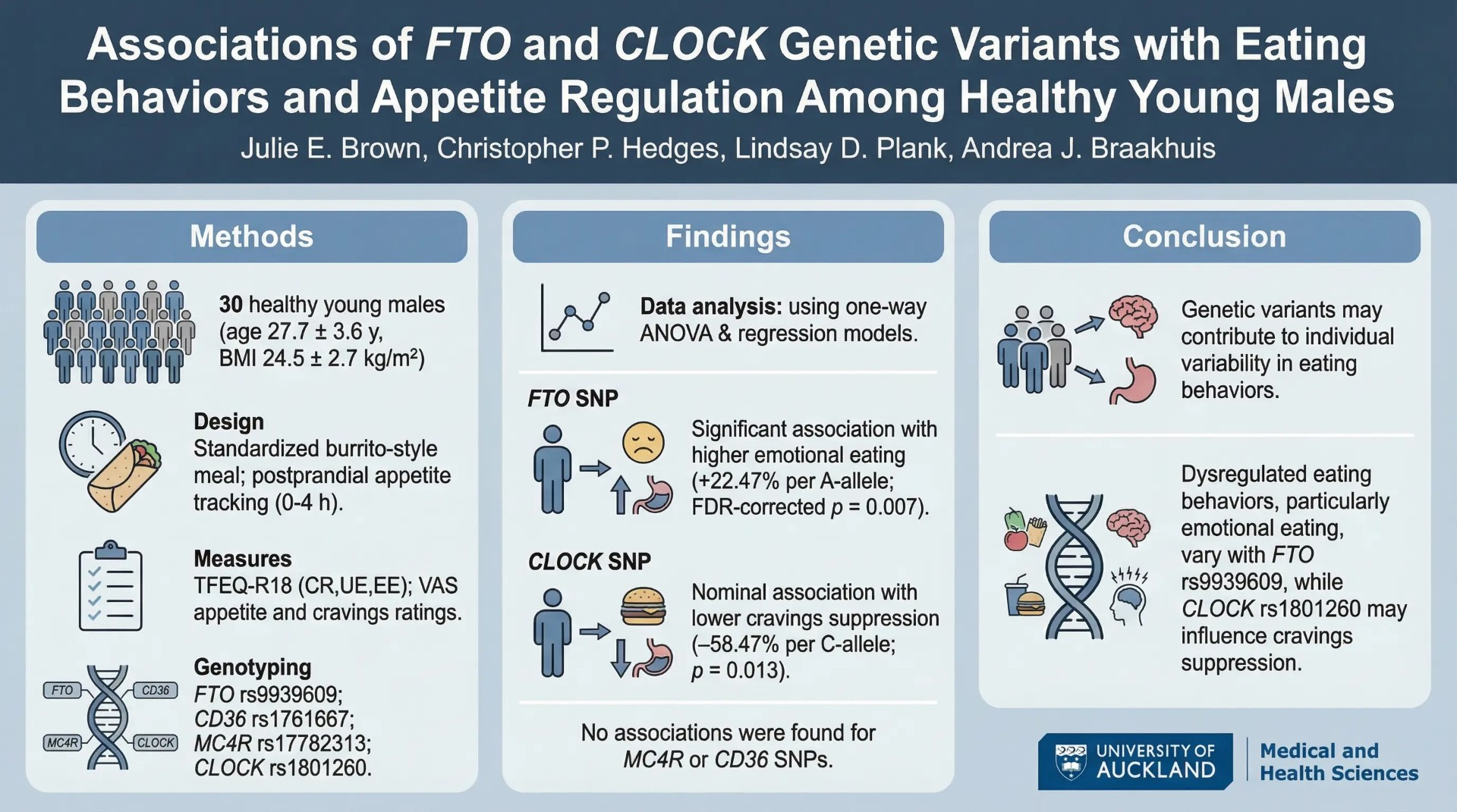 Brown JE, Hedges CP, Plank LD, Braakhuis AJ. Associations of FTO and CLOCK Genetic Variants with Emotional Eating and Reward-Related Appetite Regulation Among Healthy Young Adult Males: An Exploratory Secondary Analysis. Nutrients. 2026; 18(3):400. https://doi.org/10.3390/nu18030400