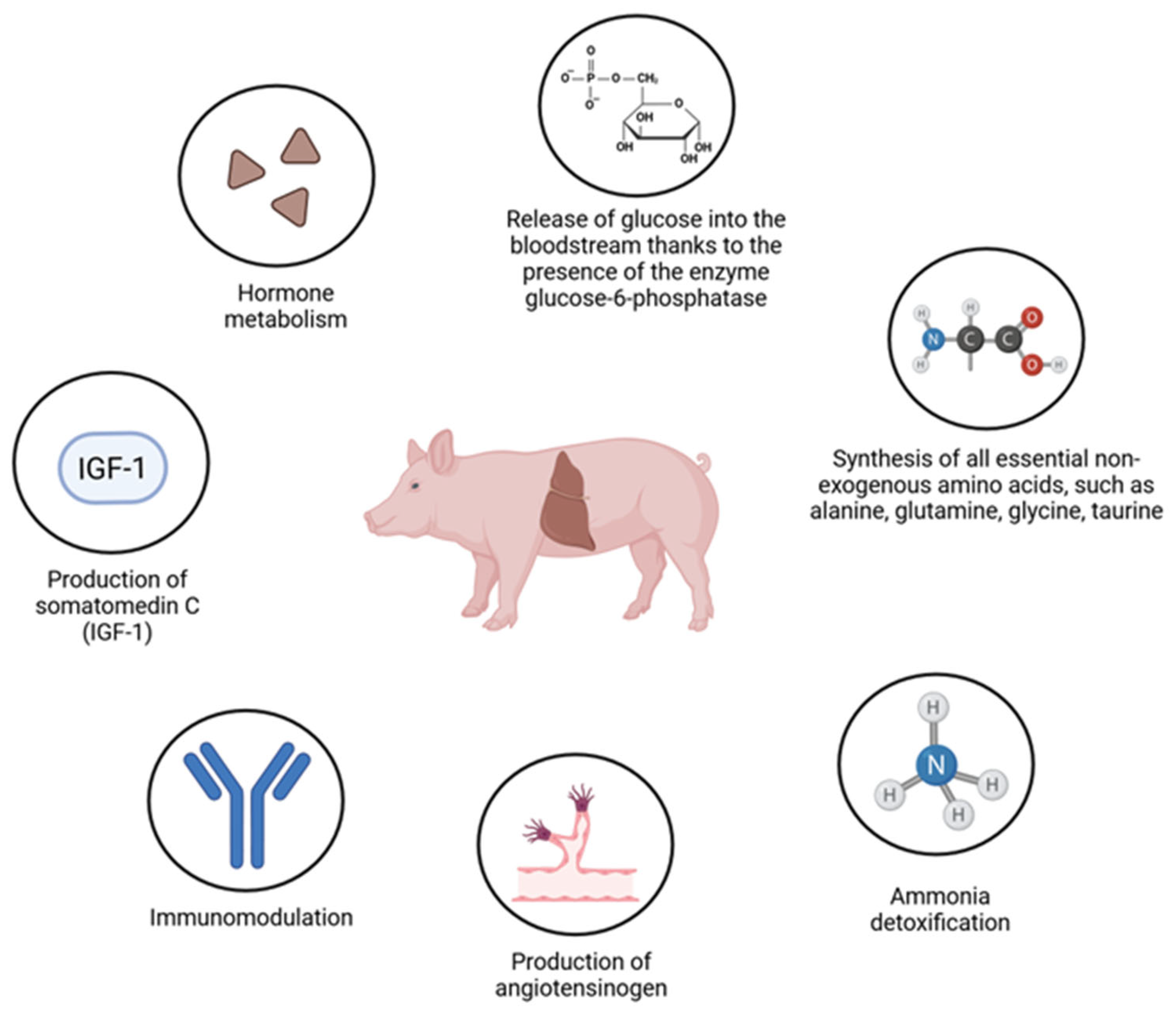 Across animal species, the liver functions as the principal metabolic hub that buffers nutrient availability and maintains systemic homeostasis. The major metabolic, endocrine, and immunological functions of the porcine liver are summarized in