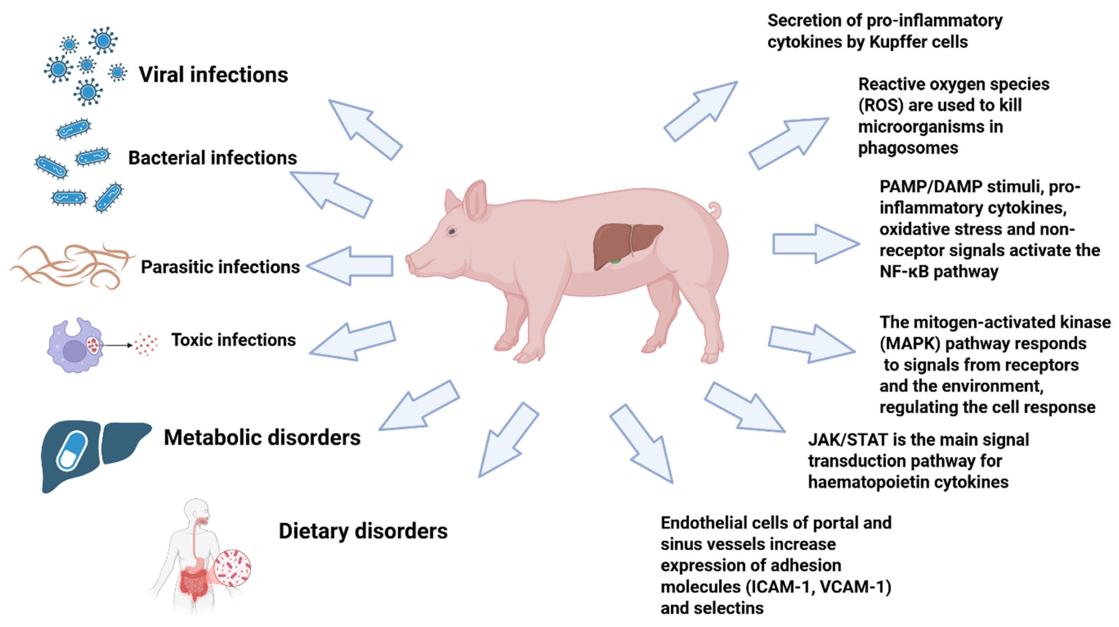 Porcine hepatitis and liver dysfunction are initiated by diverse aetiologies—viral infection, systemic bacterial dissemination, and hepatotoxic feed contaminants—but they largely converge on the same intrahepatic pathophysiological axis: Kupffer-cell activation and cytokine amplification, oxidative stress, hepatocyte death programs, and tissue remodeling with fibrogenic progression if injury persists. This convergence is critical for intervention logic because it identifies tractable nodes (NF-κB/MAPK/JAK/STAT signaling and redox imbalance) that sit upstream of hepatocellular injury and fibrosis. Accordingly, the major etiological categories and shared molecular mechanisms implicated in porcine liver dysfunction are summarized in