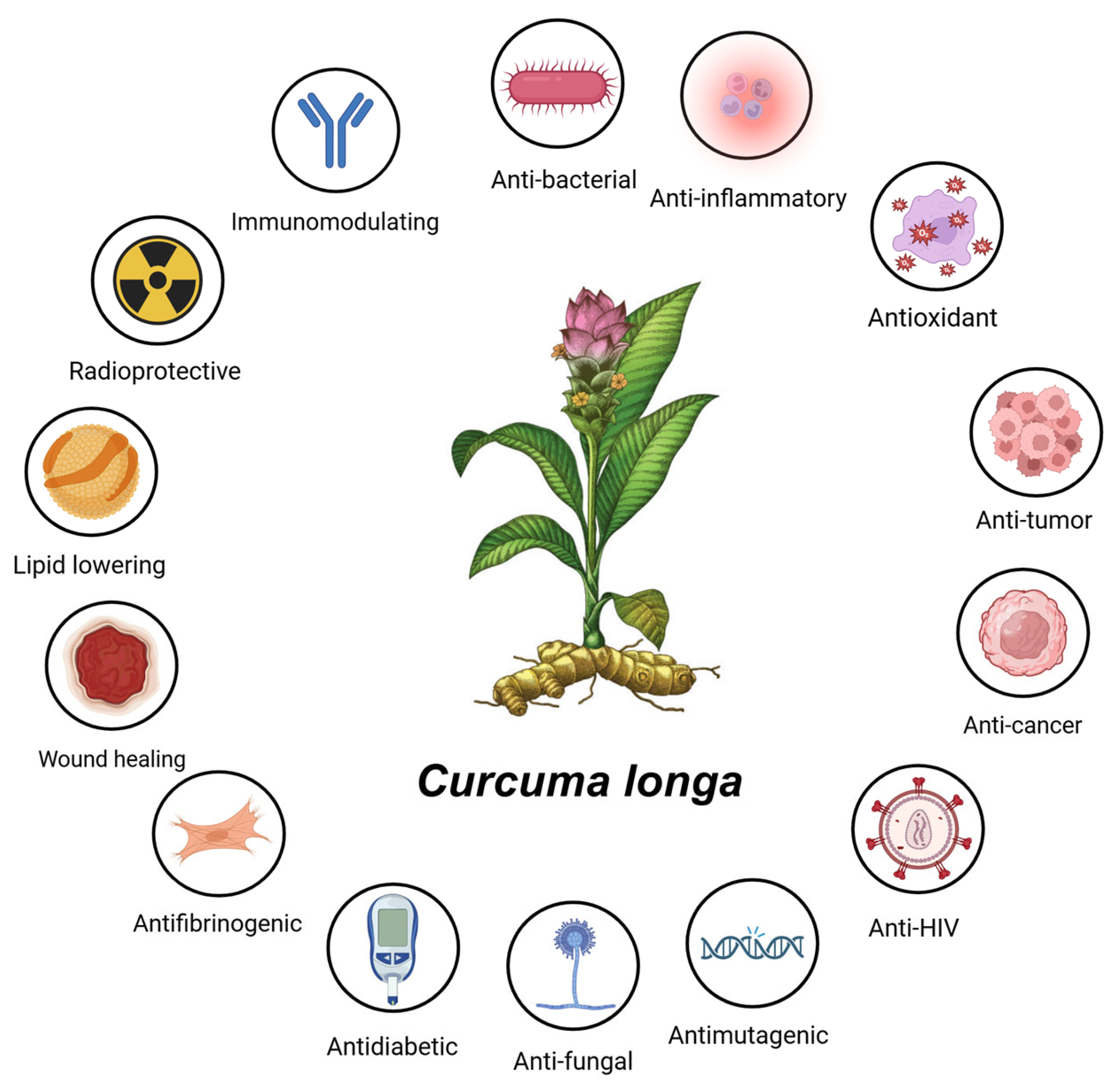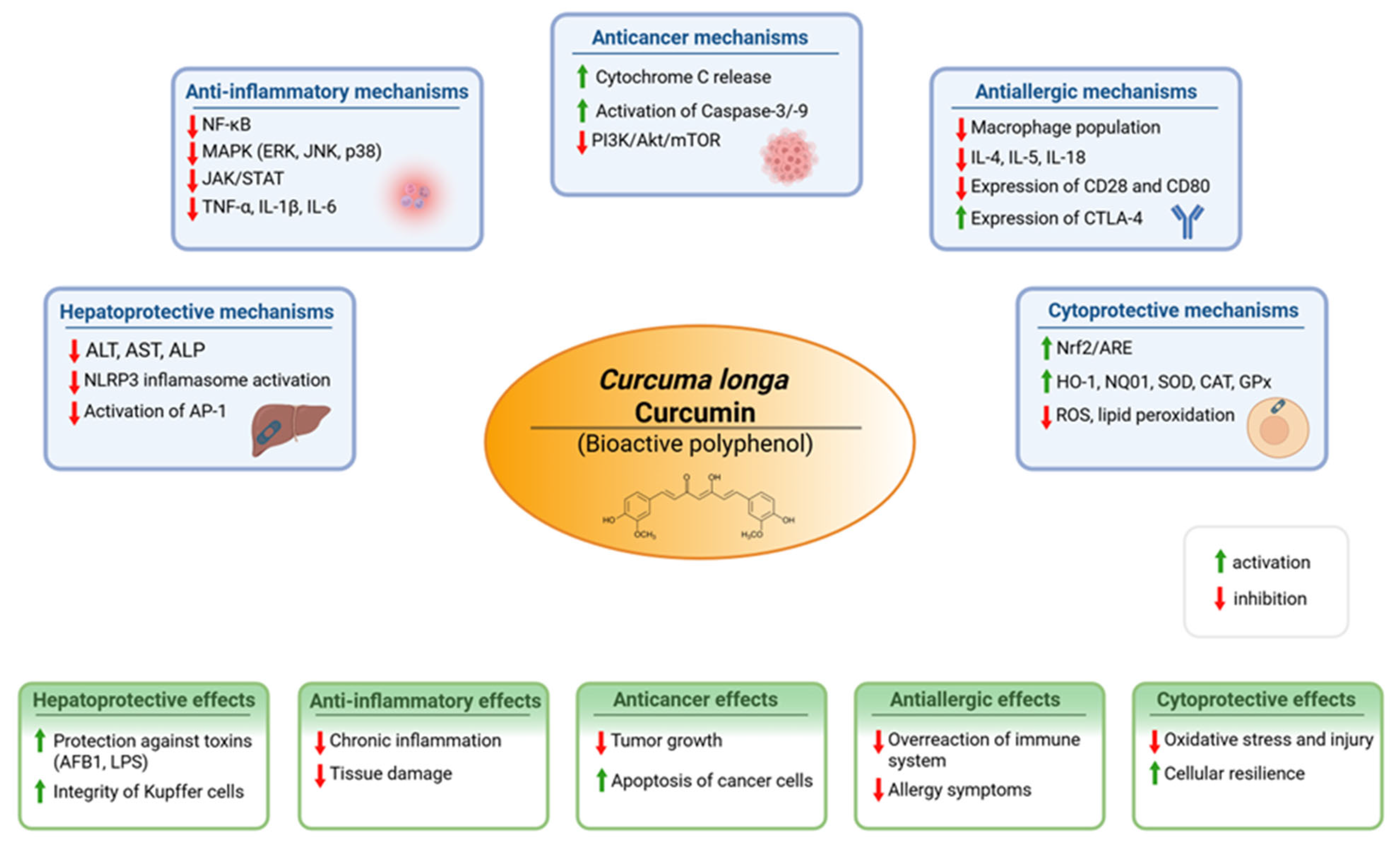Clinical applications of Curcuma longa and curcumin. The down arrow (↓) indicates a decrease in level, while the up arrow (↑) indicates an increase in the level of a given process.