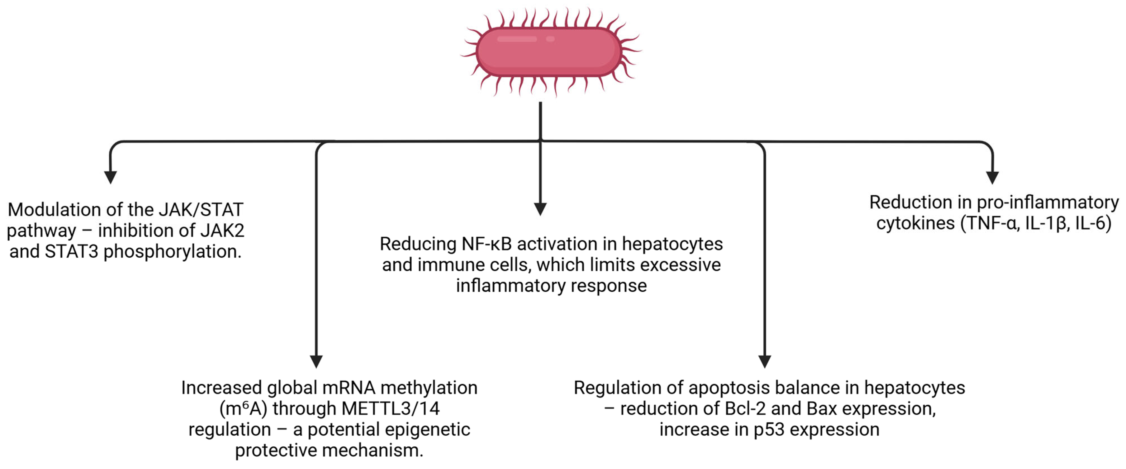 | Immunomodulating | Modulation of innate and adaptive immune responses; attenuation of TLR4-driven inflammatory signaling; inhibition of JAK/STAT pathways via induction of SOCS1/SOCS3; polarization of macrophages and microglia toward anti-inflammatory phenotypes; suppression of dendritic cell maturation and antigen presentation; rebalancing of cytokine profiles (↓ TNF-α, IL-1β, IL-6; ↑ IL-10, IL-4); indirect immune modulation via gut barrier reinforcement and microbiota remodeling | Predominantly preclinical evidence from non-porcine and non-hepatic models; limited direct validation in porcine immune cells and liver-resident macrophages (Kupffer cells); context- and dose-dependent effects; unclear contribution of microbiota-mediated versus cell-intrinsic mechanisms; lack of clinical immunomodulatory endpoints | [43,48,49,50,52,57,77,86] |