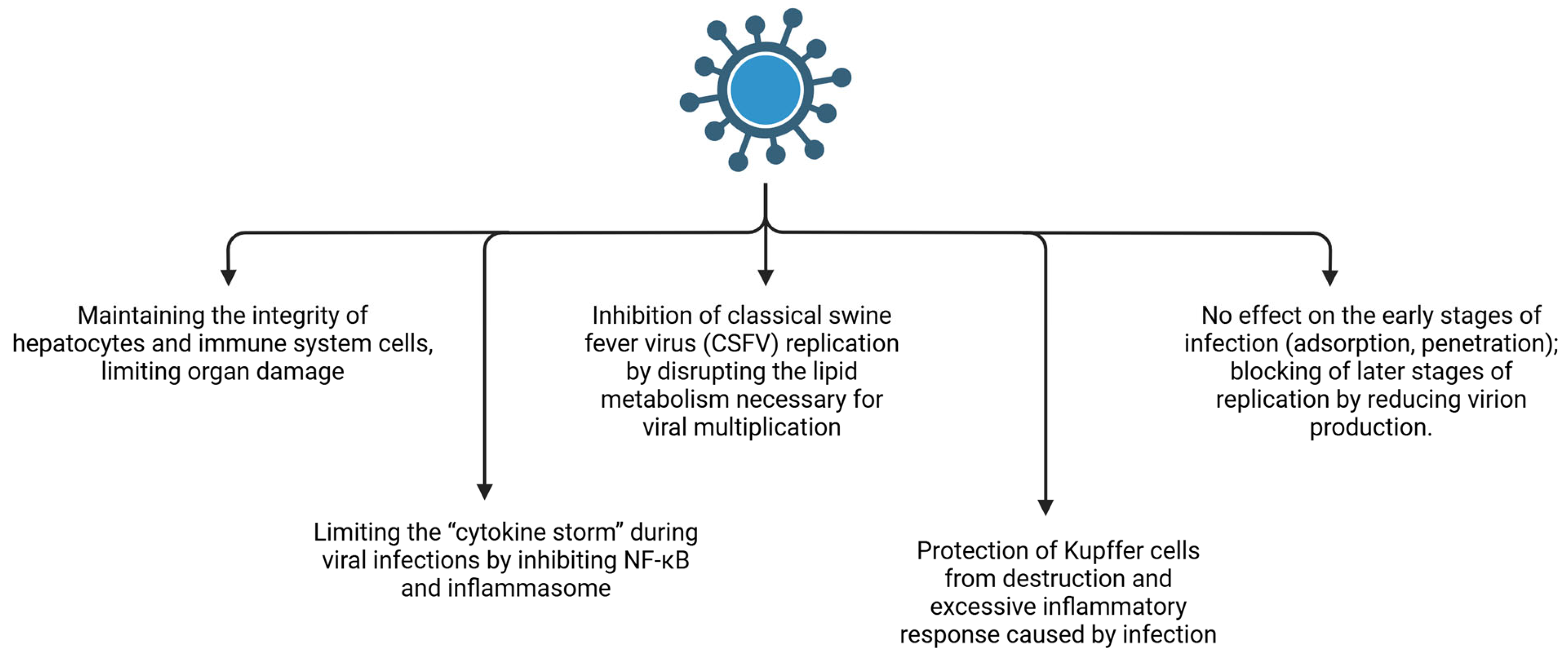 | Viral infection–associated liver injury (CSFV, PRRSV) | Yes—reduced viral load and inflammatory injury markers | Yes (macrophages) | Yes | Direct (virus-specific) | Direct antiviral effects demonstrated mainly in vitro; in vivo protection combines antiviral and immunomodulatory mechanisms |