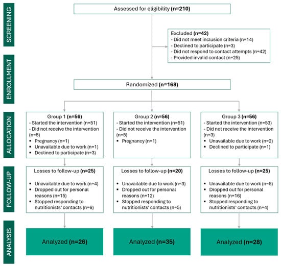 Among the 168 women randomised, 89 completed the six-month intervention (G1 = 26; G2 = 35; G3 = 28), corresponding to a retention rate of 53%. Baseline anthropometric, metabolic, and psychosocial characteristics were comparable across groups (Table 3).