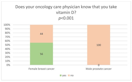 Among the individuals taking vitamin D from the date of their cancer diagnosis until the date of the survey, only 39.5% said that their oncology care physicians knew about their vitamin D use. This percentage represents the sum of respondents who had informed their physician about it (6.6%), or those whose physician had recommended taking vitamin D (31.6%), or those whose physician had asked whether they take vitamin D (1.3%) (Table 3). Professionally active respondents were significantly more likely than retired respondents to report that their oncology care physicians knew about their vitamin D use (63.4% vs. 30%; p < 0.001). Respondents who reported that their oncology care physicians knew about their vitamin D use were also significantly younger than those who reported no such awareness (mean age 58.7 ± 7.9 vs. 65.7 ± 10.1 years; p = 0.002) (Table S2). Among the individuals taking vitamin D, women were significantly more likely than men to report that their oncology care physicians knew about their use (56% vs. 0%; p < 0.001) (Figure 1). Among women, the most common reason for their physicians’ knowledge of supplementation was that the physicians had recommended that their patients take this vitamin. Among the men surveyed, none had informed their oncology care physician about their vitamin D use, most often citing that their physician had not asked them about it. Similarly, among women supplementing vitamin D and not informing their physician about its use, the most frequently cited reason for not informing oncology care physicians about their vitamin D use was that the physician did not ask about it (Table 3).
