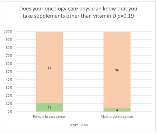 - Among vitamin D users, only 39.5% reported that their oncology care physicians knew about their vitamin D intake. Only 7.5% of respondents taking supplements other than vitamin D stated that their oncology care physicians knew about their use of supplements other than vitamin D. The others most frequently indicated that the reason for not informing their physician about taking supplements was that the physician did not ask them about this issue.