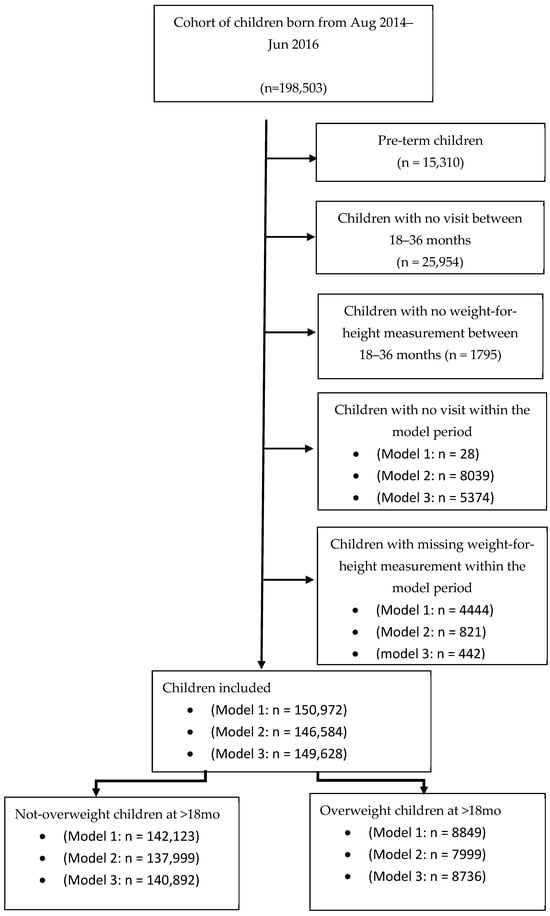 A total of 198,503 children born between August 2014 and June 2016 who had relevant records in the THIS national program database were screened (approximately 60% of the children born in Israel during this period). Altogether, 15,310 pre-term children (gestational age < 37 weeks), children lacking at least one visit (N = 25,954), or with a missing value of the weight-for-height measurement between ages 18 and 36 months (N = 1795) were excluded from the analysis. Children lacking at least one visit during the specific model period (0–3 months: N = 28, 3–6 months: N = 8039, and 6–12 months: N = 5374) and children with missing weight-for- length (or weight-for-height) measurements were also excluded (0–3 months: N = 4444, 3–6 months: N = 821, and 6–12 months: N = 442). Overall, 150,572, 146,584, and 149,628 children were included in Models 1, 2, and 3, respectively (Figure 1). Main cohort characteristics are summarized in Table 1.