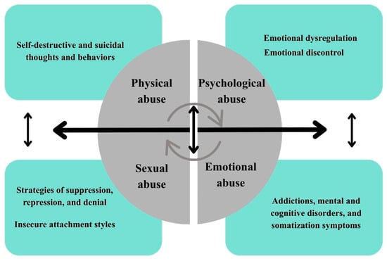 The impact of trauma on strategies and mechanisms involving the circular cycle. Explanations: Bidirectional arrows indicate reciprocal relationships between types of abuse and psychological outcomes. Circular arrows represent reinforcing cycles among different forms of abuse and their consequences.