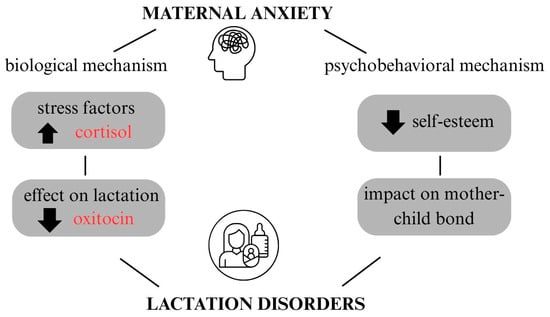 Anxiety initiated during pregnancy is associated with subsequent difficulties in breastfeeding [27]. Anxiety can be a barrier to optimal breastfeeding in women who experience it. Two mechanisms through which anxiety affects breastfeeding have been identified: biological and psychobehavioral [121] (Figure 3). Biologically, anxiety is associated with disturbances in oxytocin secretion and dysregulation of the hypothalamic–pituitary–adrenal axis, which can interfere with the milk ejection reflex and, as a result, hinder the feeding process. On the other hand, the psychobehavioral mechanism refers to the impact of anxiety on the mother’s emotional state lowers her sense of self-efficacy and self-worth, which negatively affects mother-child interactions and the breastfeeding experience itself. As a result, although prenatal anxiety does not necessarily directly interfere with lactation itself, it can significantly affect the psychological aspect of feeding, reducing the mother’s confidence and satisfaction with breastfeeding [119,121]. Neupane et al. [122] showed that the co-occurrence of anxiety and postpartum depression affects exclusive breastfeeding and significantly reduces the chances of maintaining it for the first six months of a child’s life. Early diagnosis and psychological support can reduce the negative effects of mood disorders and anxiety by helping with emotional regulation, stabilizing stress levels, and strengthening the mother-child relationship [123,124].