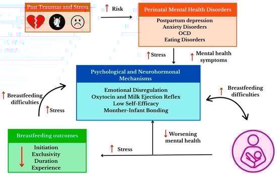 Breastfeeding is a complex process involving physiological, hormonal, and psychological mechanisms. Milk production and secretion depend on a properly developed mammary gland and hormonal regulation [143]. These reactions are strongly modulated by psychological factors—stress levels, previous emotional experiences, as well as a history of trauma or anxiety and depressive disorders [6]. Figure 4 shows the interactions between trauma, mental health, and breastfeeding mechanisms.