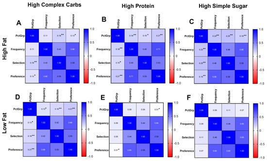 Intake and food rating correlation matrices by questionnaire. Heat maps demonstrating correlation between objective intake (PctGrp) and food rating on questionnaire, separated by specific food group, (A) high fat/high complex carb, (B) high fat/high protein, (C) high fat/high simple sugar, (D) low fat/high complex carb, (E) low fat/high protein, (F) low fat/high simple sugar. Relevant significant relationships between intake and score are denoted with * p < 0.05; ** p < 0.01. N = 279.