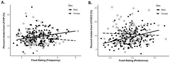 Significant interactions between food ratings and sex on PctGrp were found for LF/HP frequency (p = 0.016) and LF/HCC preference (p = 0.0053) (Table 3). Simple slope analyses revealed LF/HP frequency questionnaire food rating was positively associated with LF/HP PctGrp intake for males (Figure 2A; male β = 1.18, p = 0.0078) but not for females (Figure 2A; female β = −0.63, p = 0.30). LF/HCC preference questionnaire food rating was positively associated with LF/HCC PctGrp intake for males (Figure 2B; male β = 1.52, p < 0.0001) but not females (Figure 2B; female β = −0.26, p = 0.61).