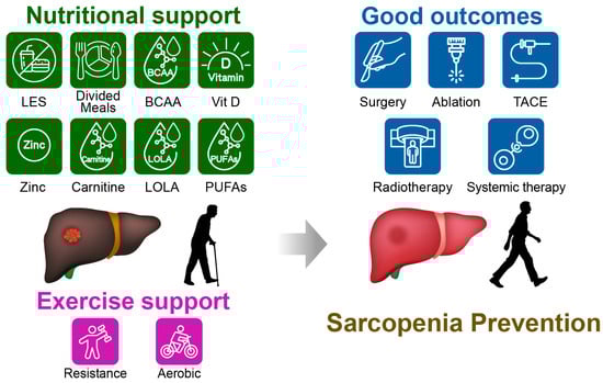 Figure 1 summarizes the nutritional and exercise support and associated clinical outcomes in sarcopenic patients with concomitant HCC. This narrative review summarizes current knowledge on the bidirectional interplay between HCC treatment and sarcopenia, with a particular focus on the role of nutritional interventions across curative and palliative settings. We first discuss the definition and assessment of sarcopenia in chronic liver disease and HCC and then outline the mechanistic links between hepatic dysfunction, systemic inflammation, and muscle depletion. We next review the impact of sarcopenia on outcomes of major HCC therapies. Finally, we show an in-depth examination of evidence supporting nutritional and exercise-based interventions.