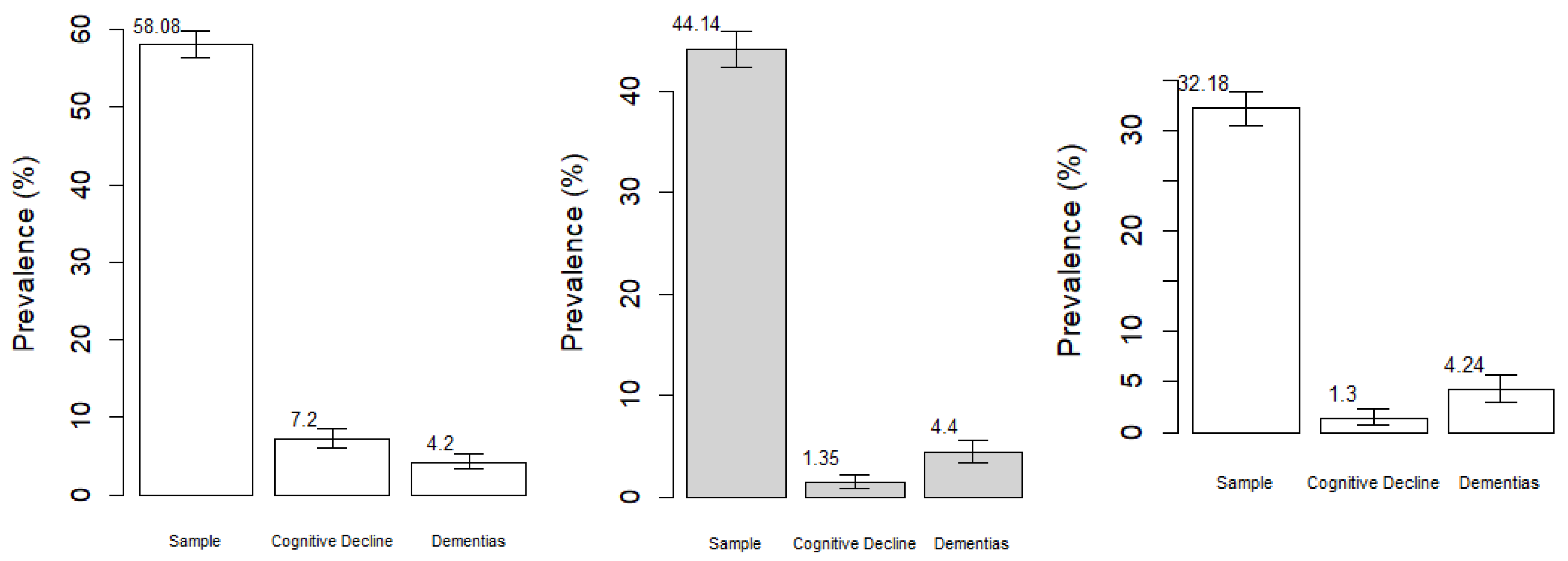 - Bertola, L.; Suemoto, C.K.; Aliberti, M.J.R.; Gomes Gonçalves, N.; Pinho, P.J.d.M.R.; Castro-Costa, E.; Lima-Costa, M.F.; Ferri, C.P. Prevalence of Dementia and Cognitive Impairment No Dementia in a Large and Diverse Nationally Representative Sample: The ELSI-Brazil Study. J. Gerontol. Ser. A 2023, 78, 1060–1068. [Google Scholar] [CrossRef]