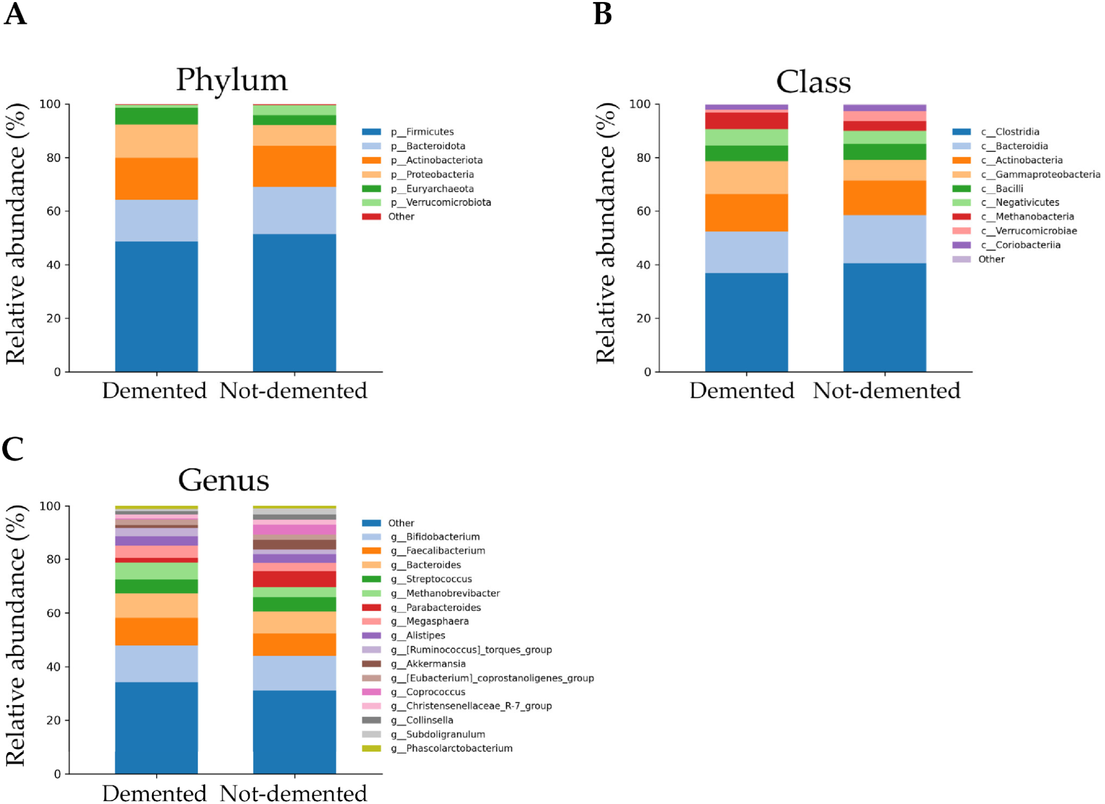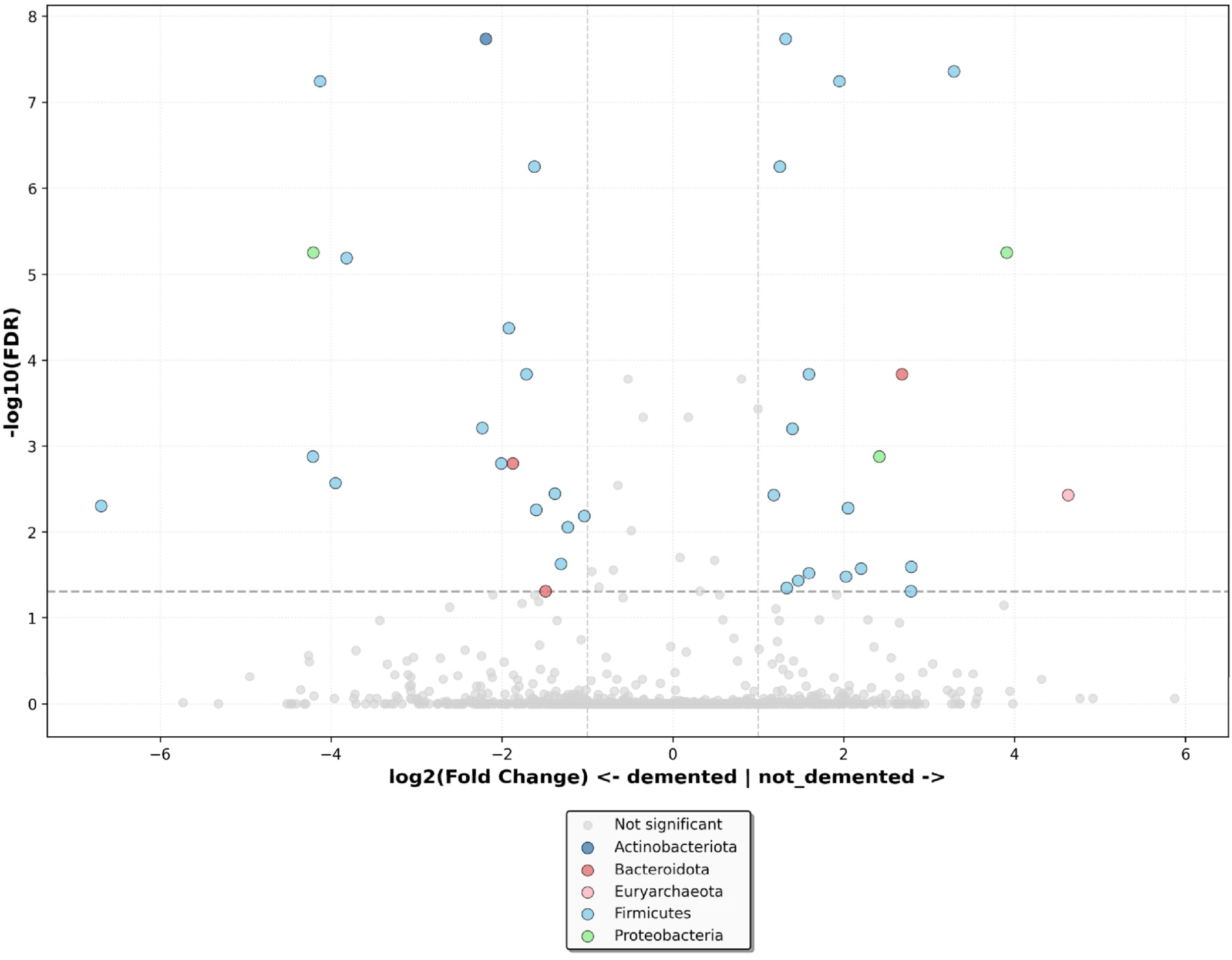 3.6. Taxonomic Profiling of the Gut Microbiota in Demented and Non-Demented Older Adults