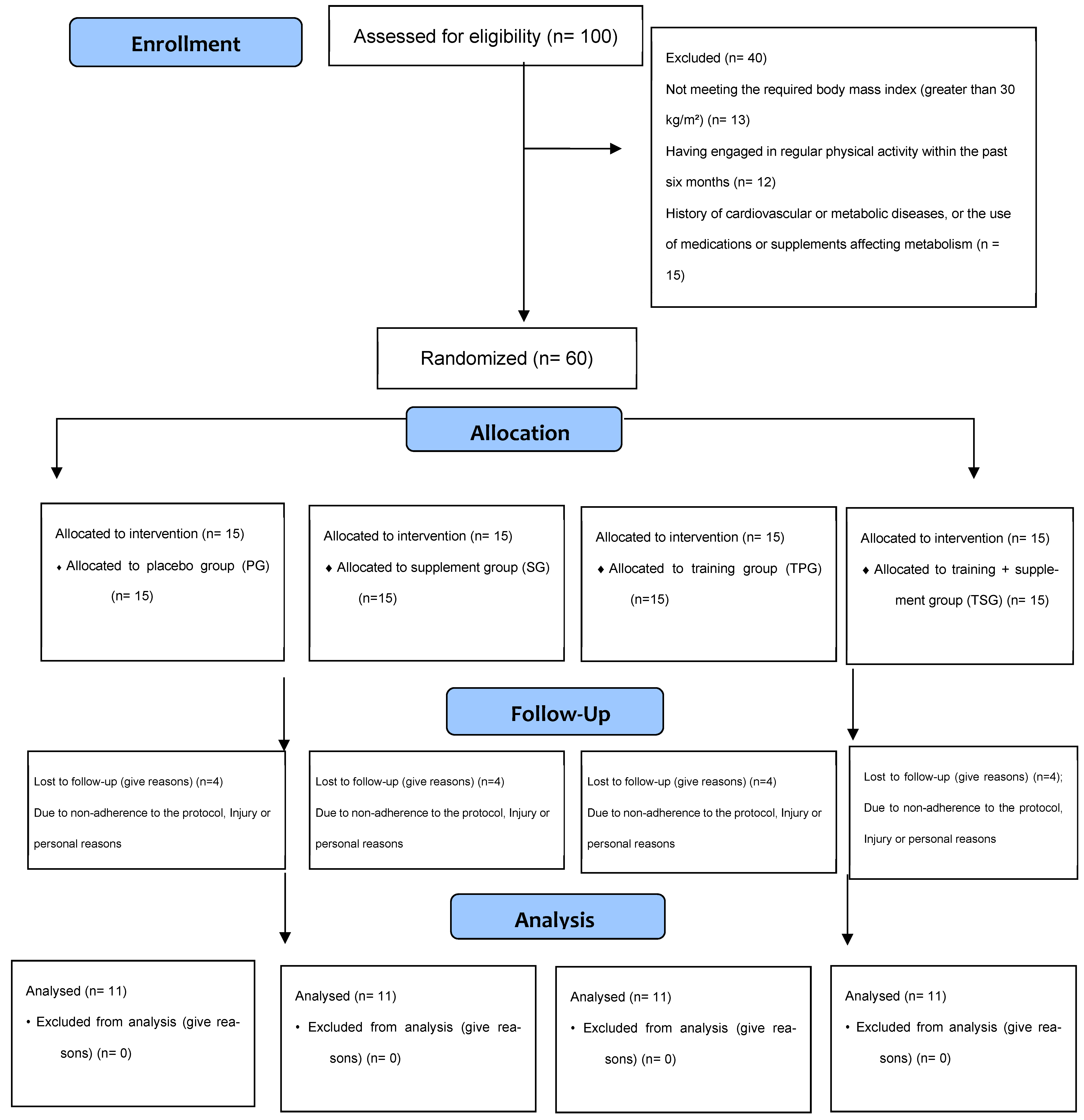 2), having engaged in regular physical activity within the past six months, a history of cardiovascular or metabolic diseases, or the use of medications or supplements affecting metabolism. Ultimately, the eligible participants were divided into four equal groups of fifteen. After screening, 60 eligible participants were enrolled in the study. These participants were randomly assigned to one of four groups (n = 15 per group): the placebo group (PG), the supplement group (SG), the training group (TPG), and the training + supplement group (TSG). During the 12-week study period, sixteen participants from various groups withdrew from the study due to medical reasons, work-related difficulties, or a lack of interest in continuing the research. This resulted in 44 participants, on whom the final analyses were conducted (n = 11 per group) (