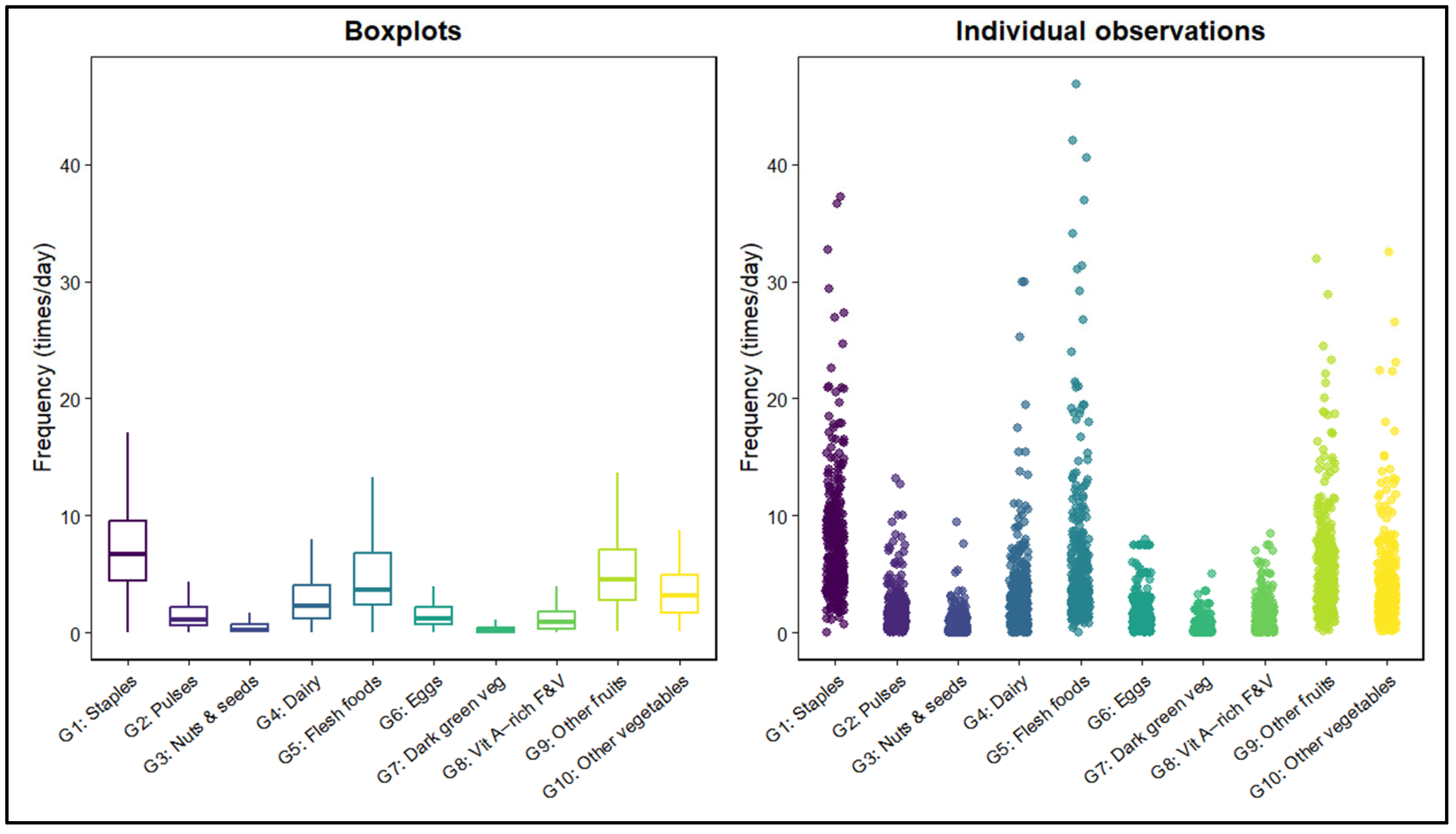 In contrast, several food groups commonly considered nutrient-dense were consumed infrequently. These included pulses (G2; median 1.04), nuts and seeds (G3; median 0.18), dark green leafy vegetables (G7; median 0.12), and vitamin A–rich fruits and vegetables (G8; median 0.92). Together, these patterns indicate that students’ diets were largely centered on staple foods and commonly available produce, while the intake of plant-based protein sources, unsaturated fat sources, and carotenoid-rich foods remained comparatively low. The distribution of daily consumption frequencies across all FAO IndiKit food groups is illustrated in