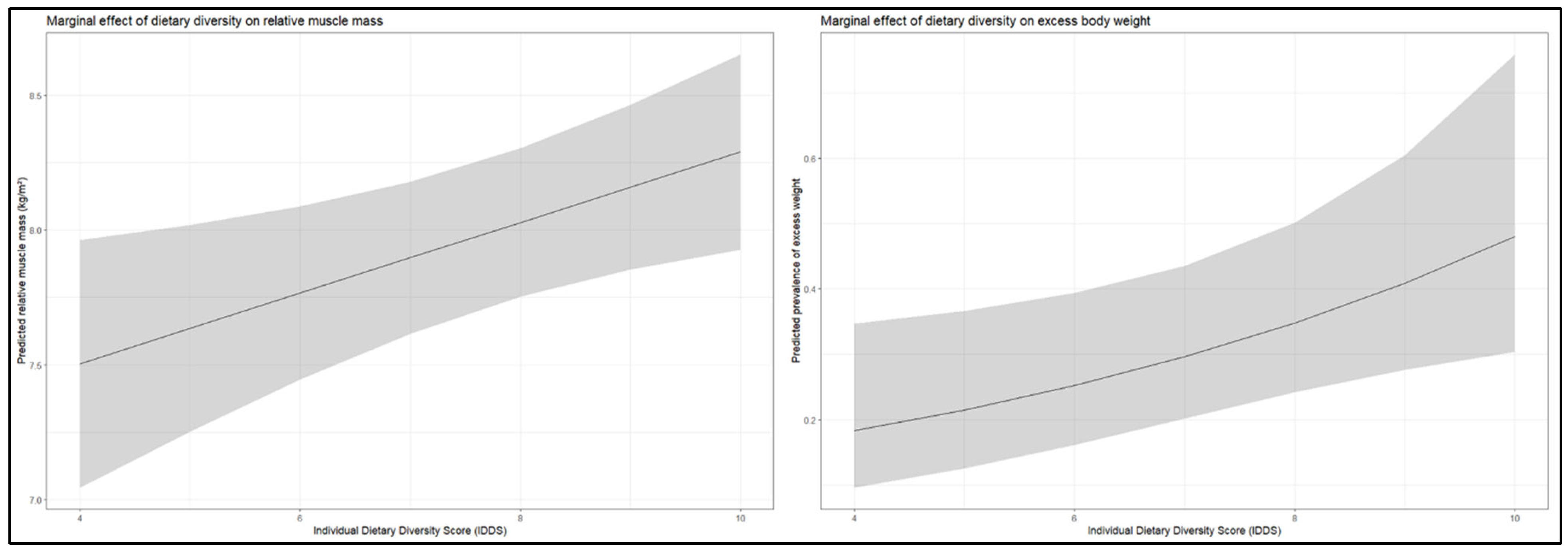 Dietary diversity, assessed using the FAO Individual Dietary Diversity Score (IDDS), showed a dual pattern of association in this study. Higher dietary diversity was positively associated with both excess body weight and relative muscle mass, whereas no association was observed with handgrip strength. These findings are consistent with the broader literature showing that the relationship between dietary diversity and adiposity is heterogeneous. A systematic review concluded that associations between dietary diversity scores and obesity vary substantially across observational studies, depending on population characteristics, scoring methods, and food environments [
