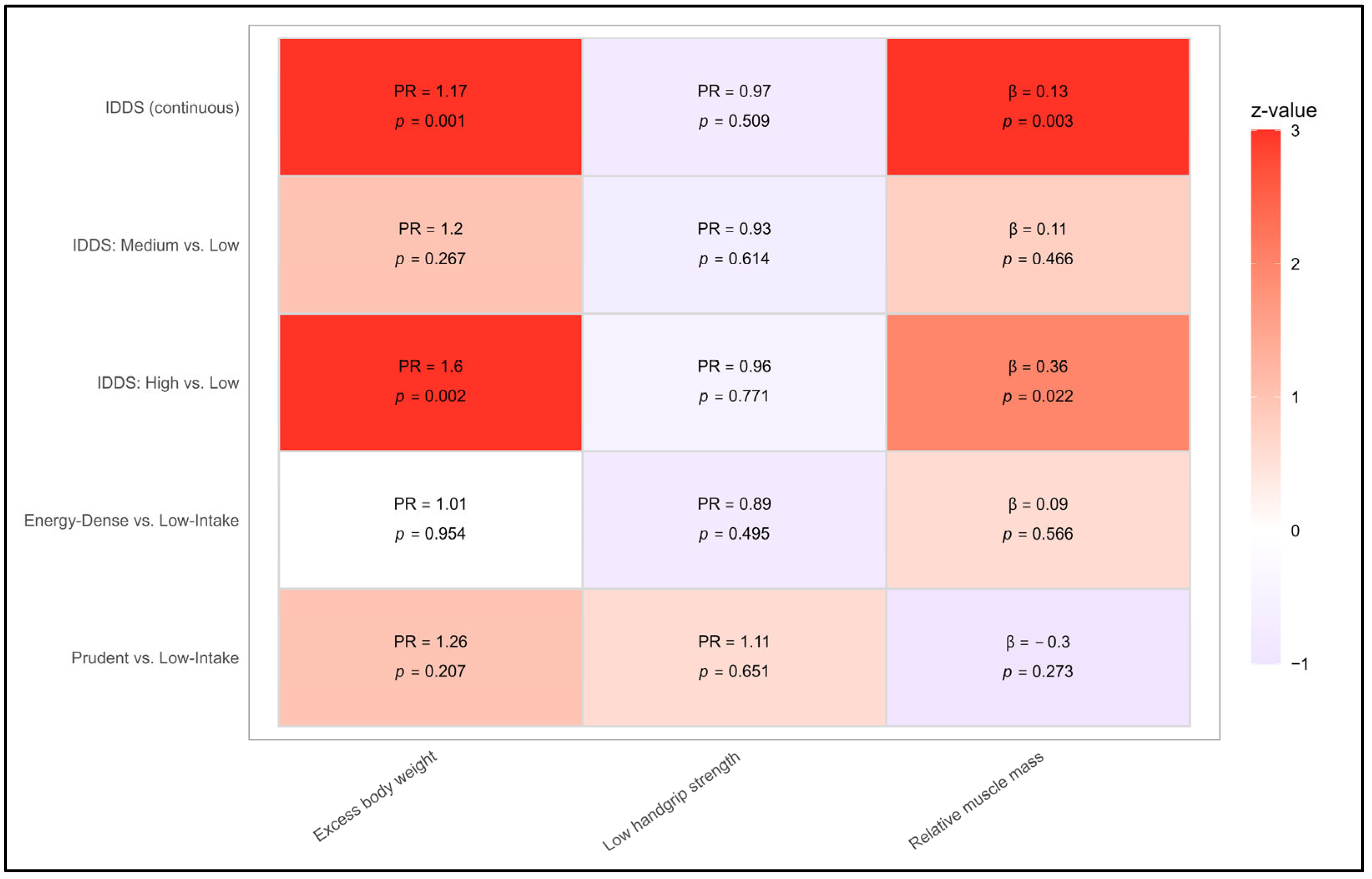 Bivariable associations between dietary exposures and health outcomes were initially examined. For dichotomous outcomes (excess body weight and low handgrip strength), Poisson regression models with robust variance estimators were fitted to obtain crude prevalence ratios (PRs) and 95% confidence intervals. For relative muscle mass, linear regression models with heteroscedasticity-robust standard errors were used.