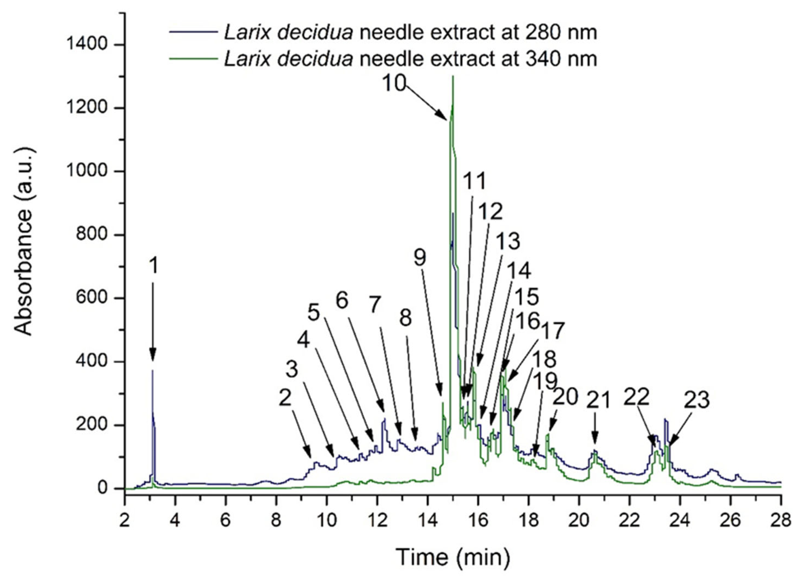 - Baldan, V.; Sut, S.; Faggian, M.; Gassa, E.D.; Ferrari, S.; De Nadai, G.; Francescato, S.; Baratto, G.; Dall’acqua, S. Larix decidua Bark as a Source of Phytoconstituents: An LC–MS Study. Molecules 2017, 22, 1974. [Google Scholar] [CrossRef]