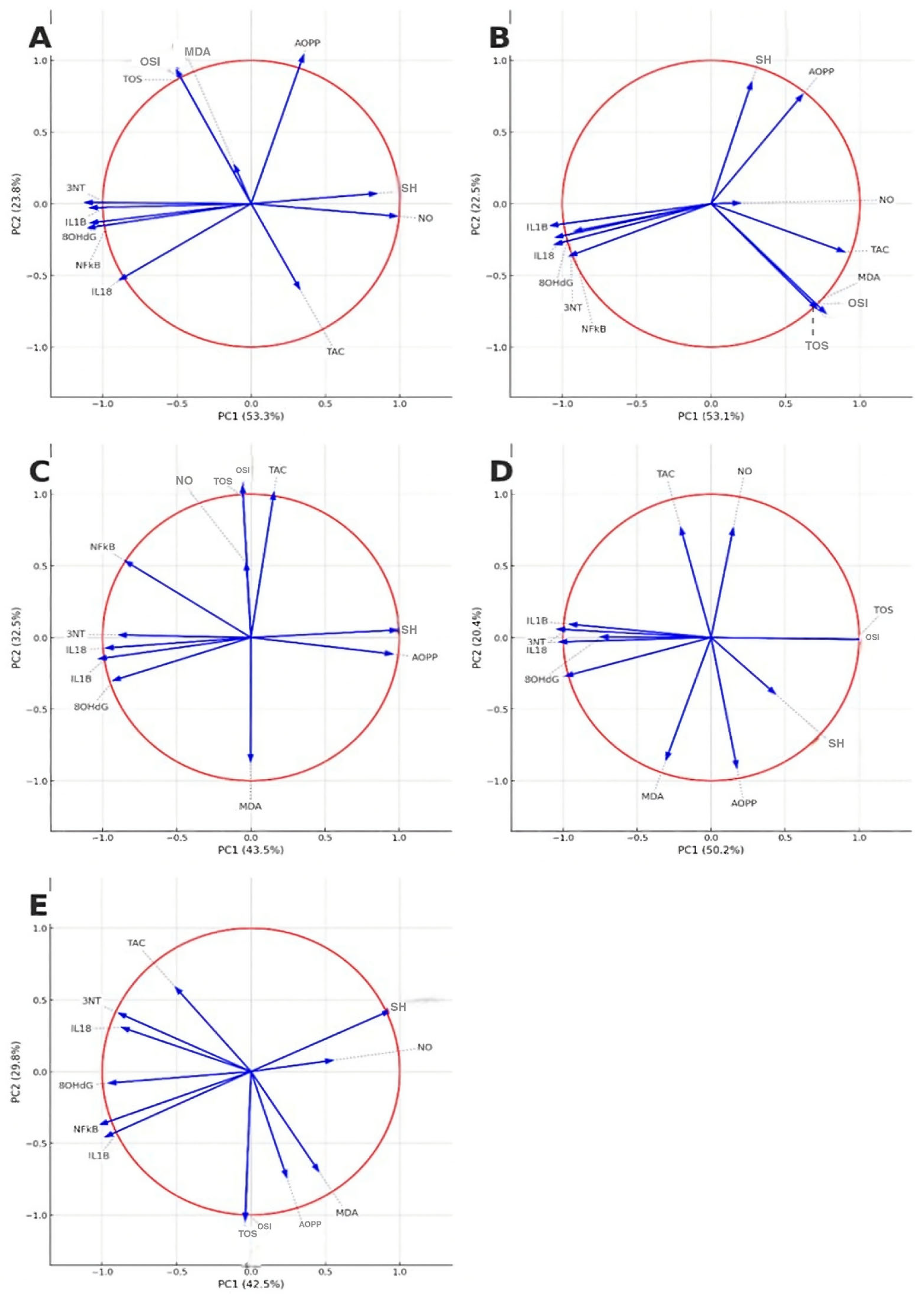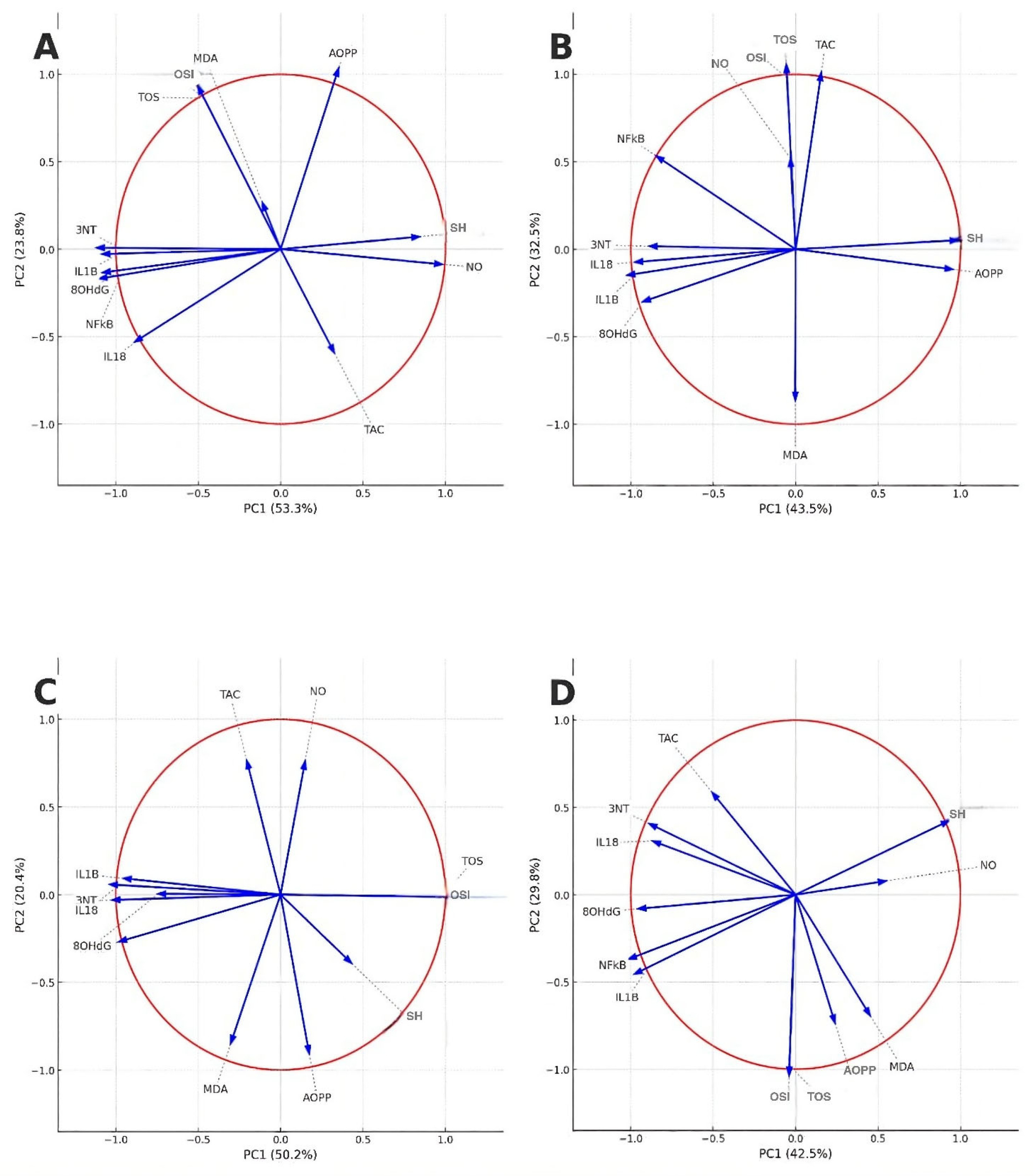 - Malenica, M.; Klisić, A.; Meseldžić, N.; Dujić, T.; Bego, T.; Kotur-Stevuljević, J. Principal Component Analysis of Oxidative Stress, Inflammation, and Dyslipidemia in Patients with Different Levels of Glucoregulation. J. Med. Biochem. 2023, 42, 427–436. [Google Scholar] [CrossRef]