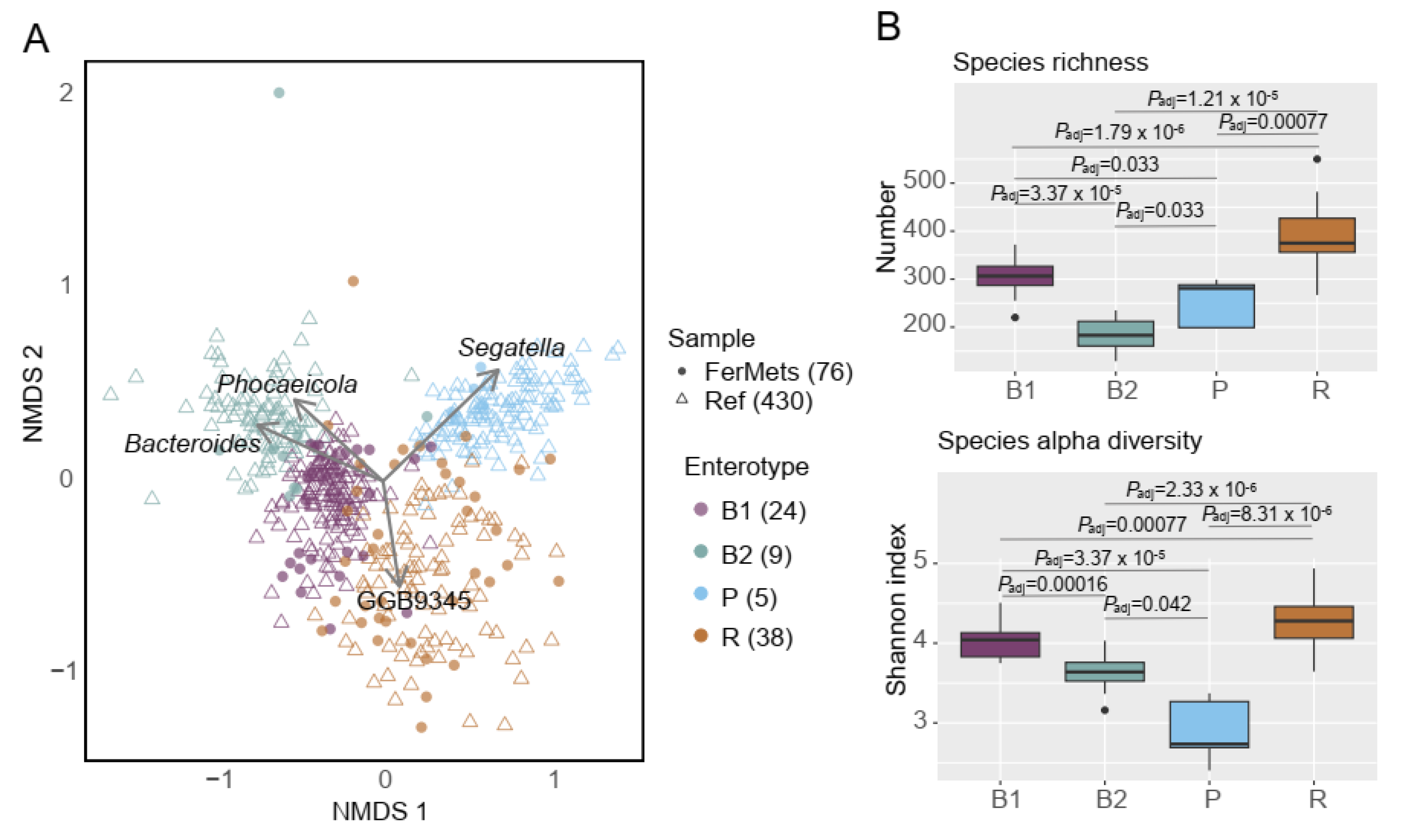 - Frioux, C.; Ansorge, R.; Özkurt, E.; Ghassemi Nedjad, C.; Fritscher, J.; Quince, C.; Waszak, S.M.; Hildebrand, F. Enterosignatures define common bacterial guilds in the human gut microbiome. Cell Host Microbe 2023, 31, 1111–1125.e1116. [Google Scholar] [CrossRef]