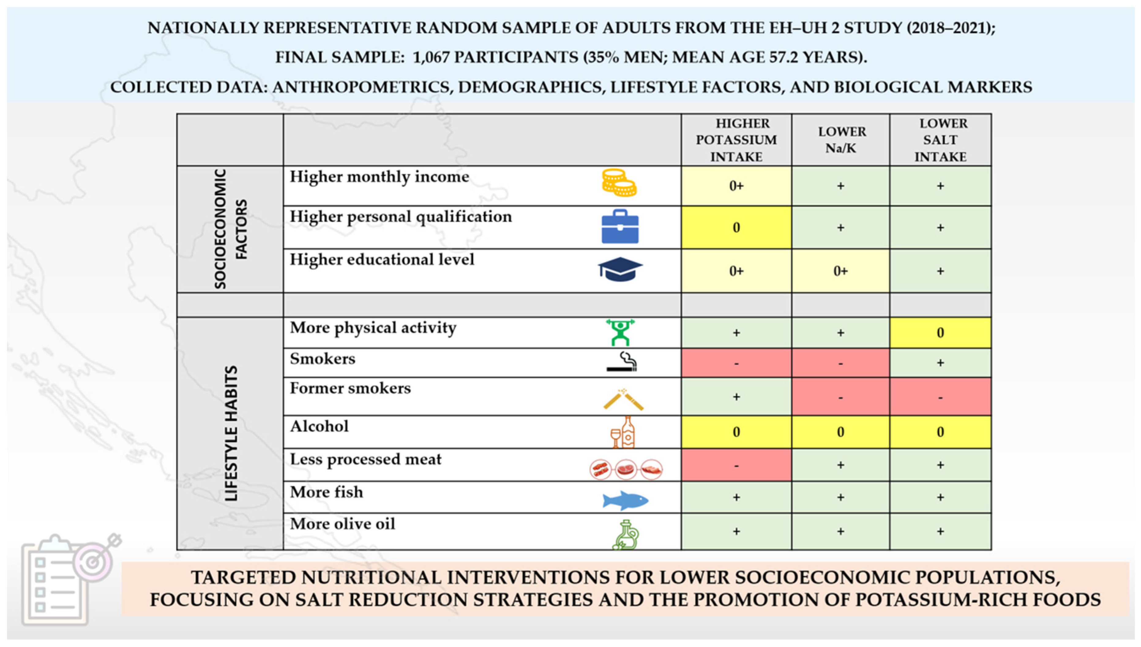 Marinović Glavić, M.; Bilobrk, M.; Bilajac, L.; Belančić, A.; Bolješić Dumančić, M.; Domislović, M.; Fuček, M.; Jelaković, A.; Josipović, J.; Nikić, J.; et al. Impact of Socioeconomic Factors and Lifestyle on Salt and Potassium Intake and Sodium-to-Potassium Ratio: EH-UH 2 Study. Nutrients 2026, 18, 615. https://doi.org/10.3390/nu18040615