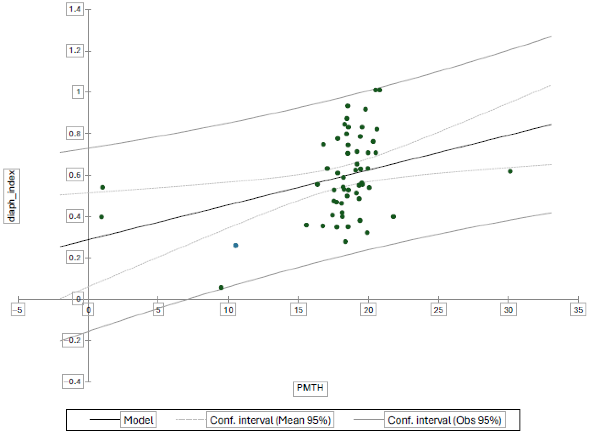 To further explore this association, a multivariate linear regression model was performed, with the diaphragm-to-height ratio as the dependent variable and the PMTH index, age, and sex as independent variables. The model confirmed a significant linear relationship between the two indices, with the diaphragm index increasing proportionally with the PMTH index (β = 0.018; 95% CI 0.005–0.030; p = 0.008). Age and sex were not significantly associated with the diaphragm index (p > 0.05).