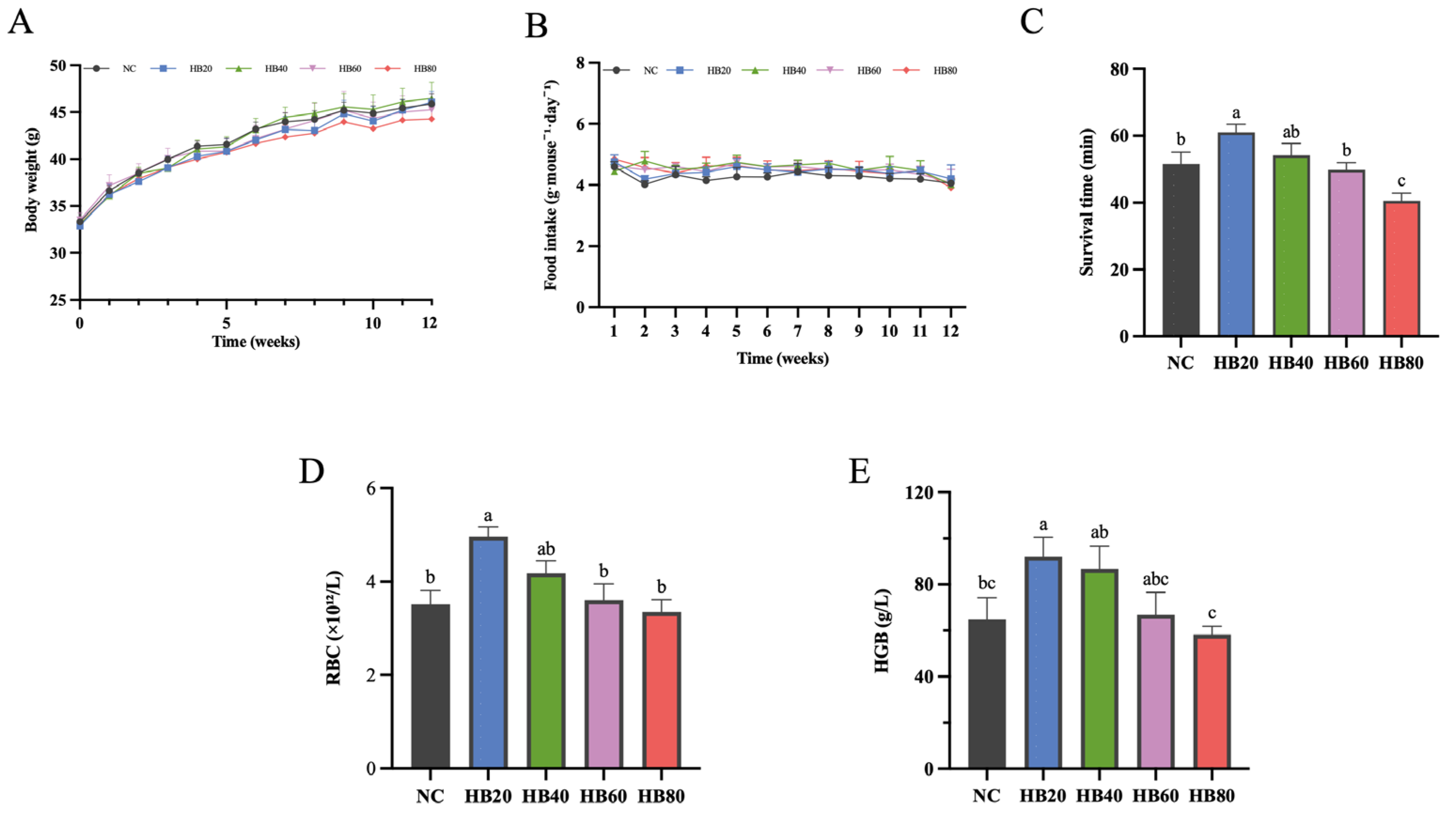 3.1. Effects of Highland Barley Dietary Intervention on Body Weight, Food Intake, and Hypoxia Tolerance in Mice