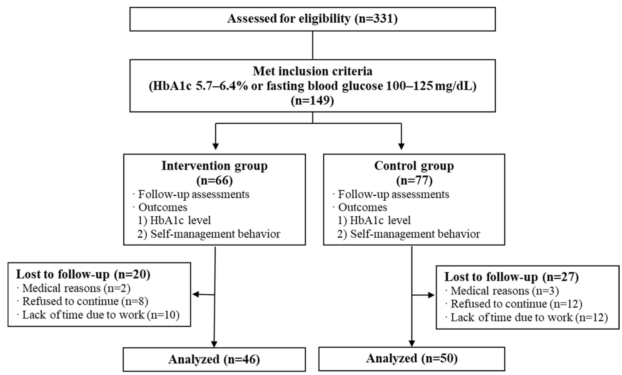 Chicago/Turabian StyleLee, Jung Hun, Hee Jin Kim, and Kang Hyun Lee. 2026. "Effects of a Text Message-Based Lifestyle Intervention on HbA1c and Health Behaviors in Older Adults with Prediabetes" Nutrients 18, no. 4: 682. https://doi.org/10.3390/nu18040682