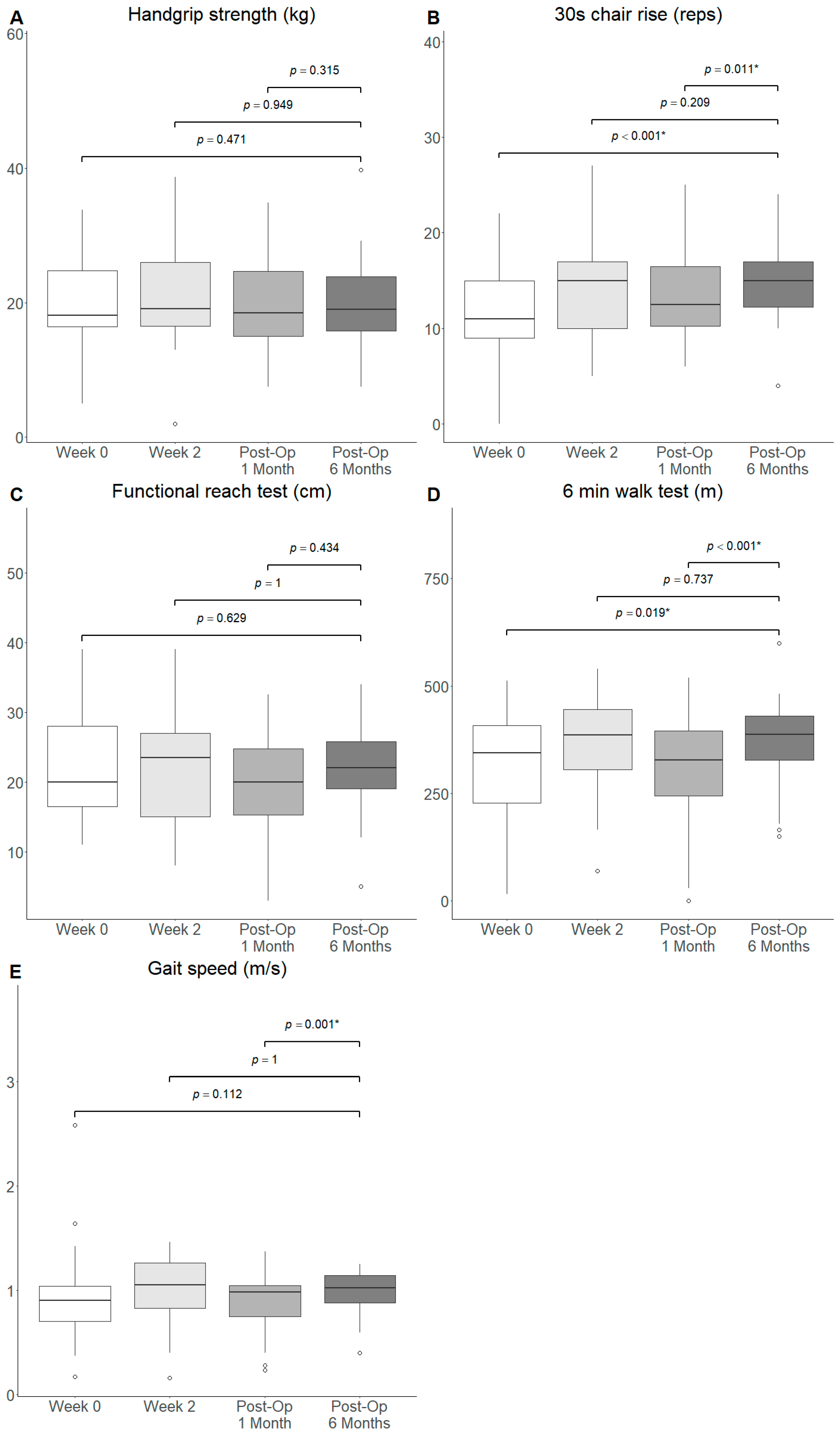 - Watters, J.M.; Clancey, S.M.; Moulton, S.B.; Briere, K.M.; Zhu, J.-M. Impaired Recovery of Strength in Older Patients After Major Abdominal Surgery. Ann. Surg. 1993, 218, 380. [Google Scholar] [CrossRef]