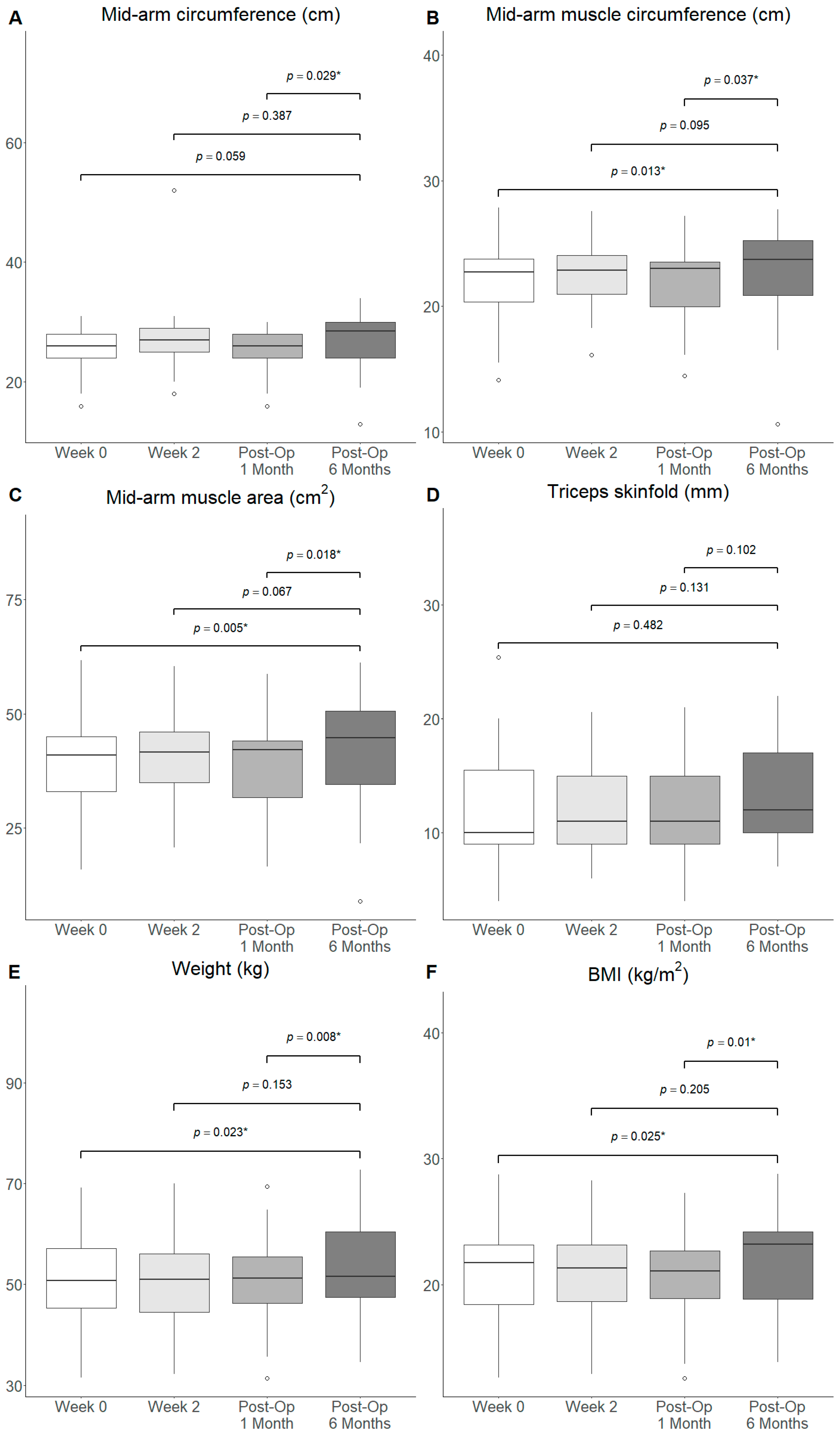 | Mid-arm muscle area (cm2) | 39.3 (32.6–44.3) | 41.6 (35.0–46.0) | 42.8 (32.3–44.2) | 40.9 (33.6–44.6) | 44.8 (34.6–50.7) |