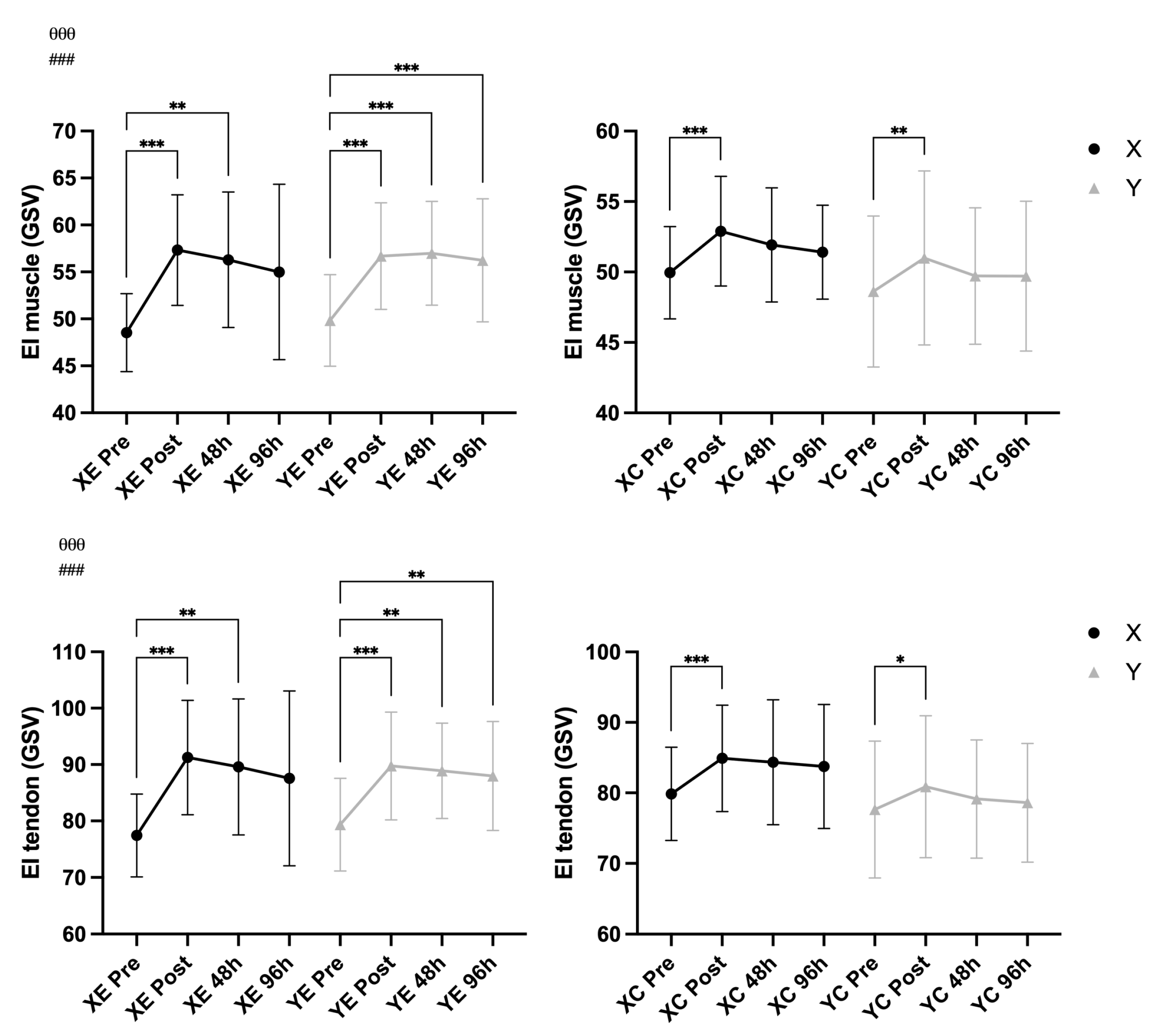 - Wong, V.; Spitz, R.W.; Bell, Z.W.; Viana, R.B.; Chatakondi, R.N.; Abe, T.; Loenneke, J.P. Exercise Induced Changes in Echo Intensity within the Muscle: A Brief Review. J. Ultrasound 2020, 23, 457–472. [Google Scholar] [CrossRef]