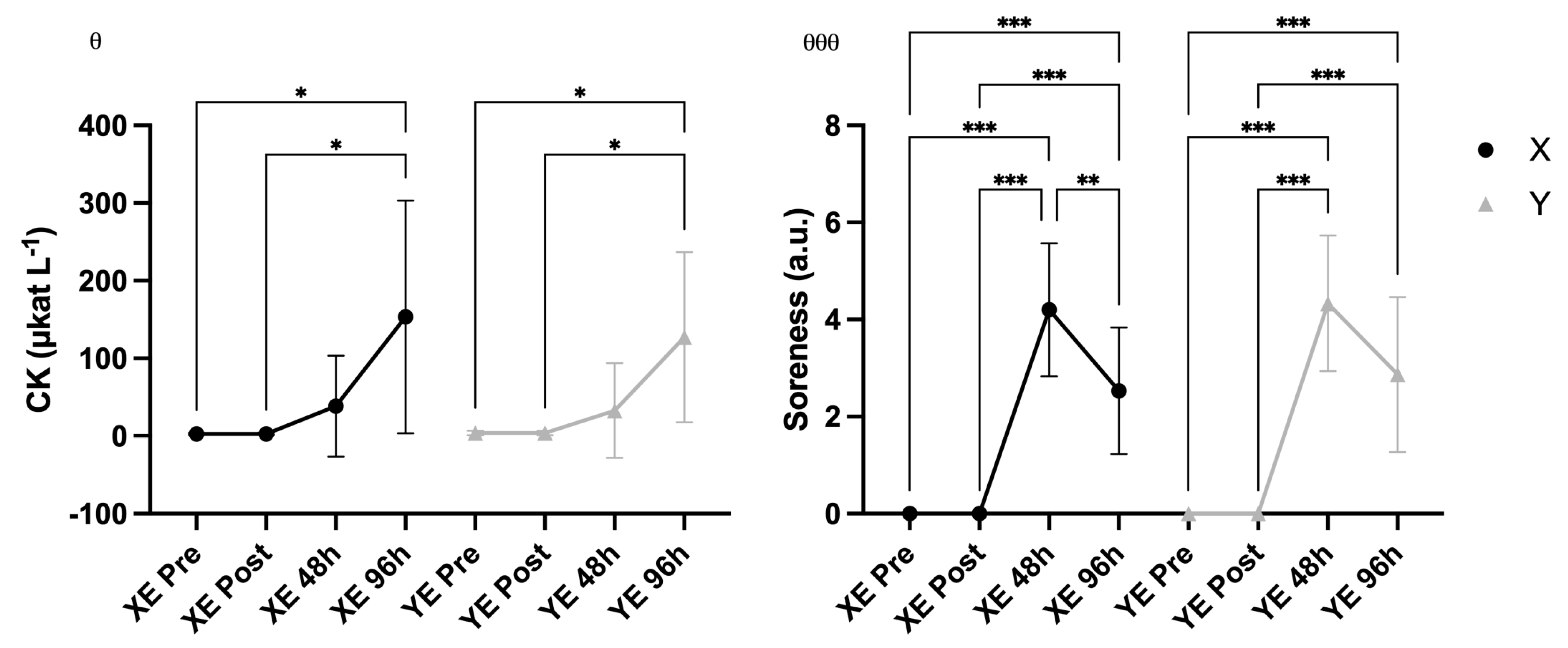 - Clarkson, P.M.; Hubal, M.J. Exercise-Induced Muscle Damage in Humans. Am. J. Phys. Med. Rehabil. 2002, 81, S52–S69. [Google Scholar] [CrossRef] [PubMed]