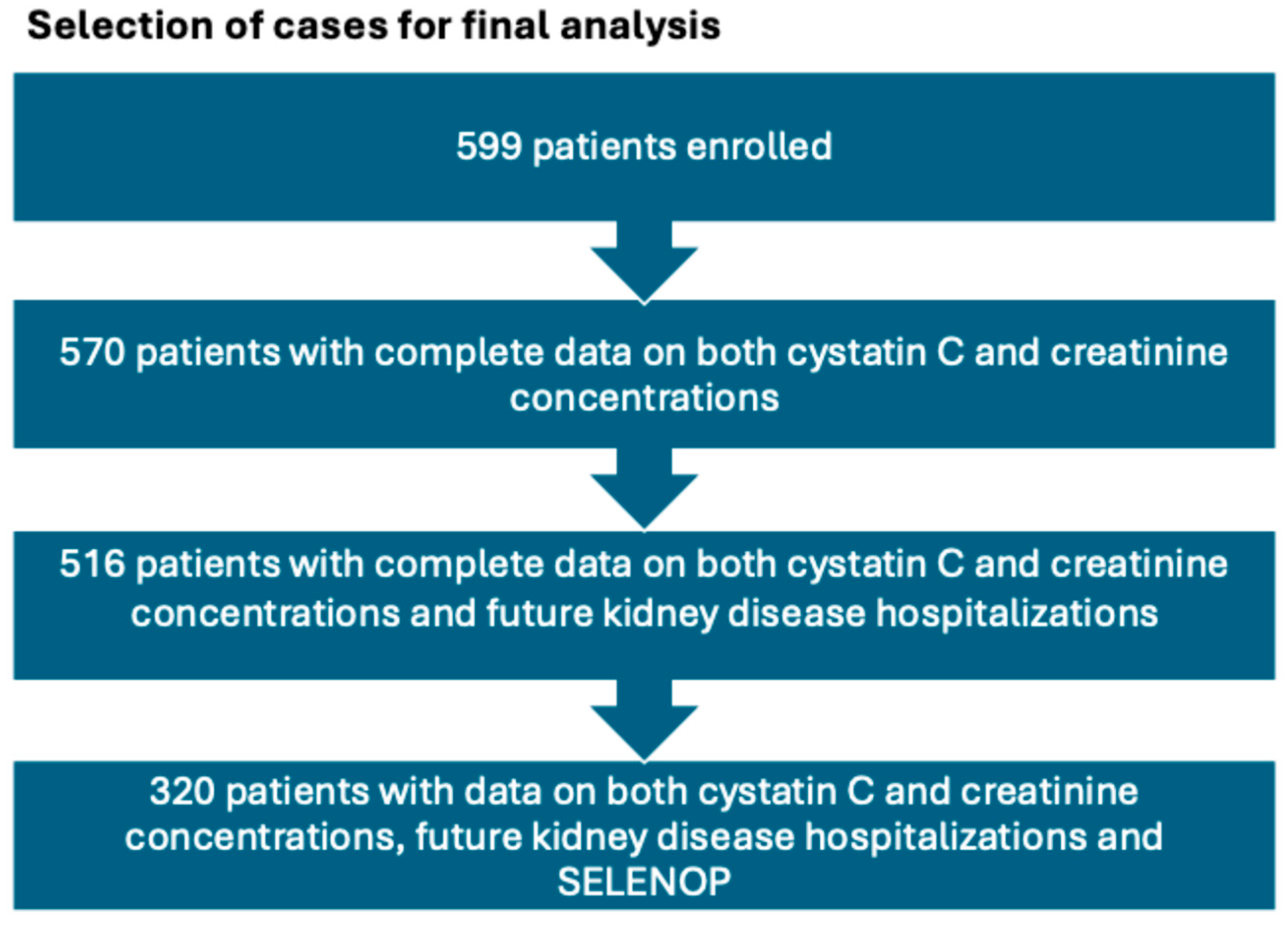 - Grubb, A.O.; Magnusson, M.; Christensson, A. Etiologic and Diagnostic Implications of Morbidity and Mortality Associations When Cystatin C-Based Estimated GFR Is Lower Than Creatinine-Based Estimated GFR. Am. J. Kidney Dis. 2023, 82, 509–511. [Google Scholar] [CrossRef]