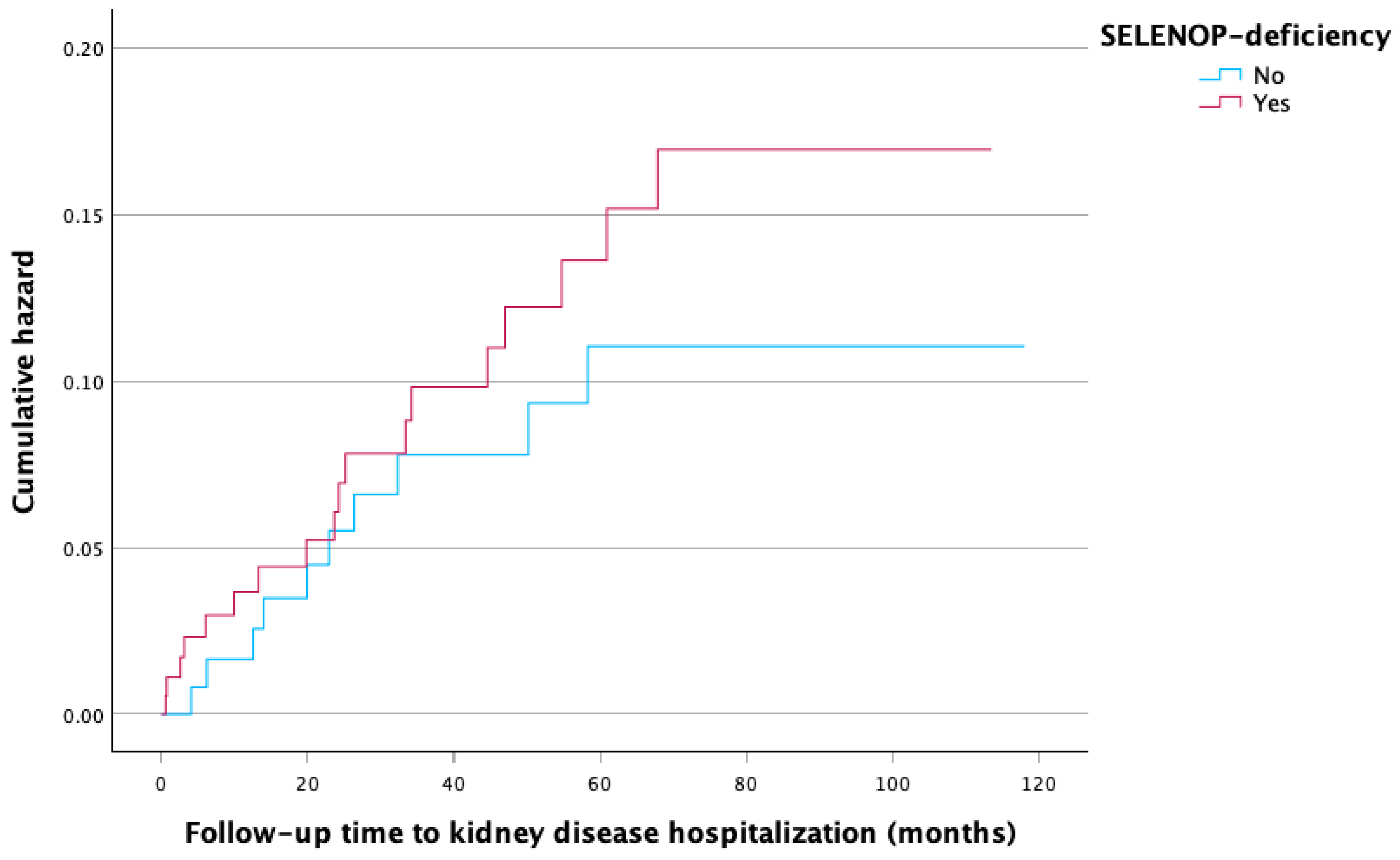 - Description of associations between low SELENOP levels (<3.23 mg/L) and kidney disease hospitalizations.