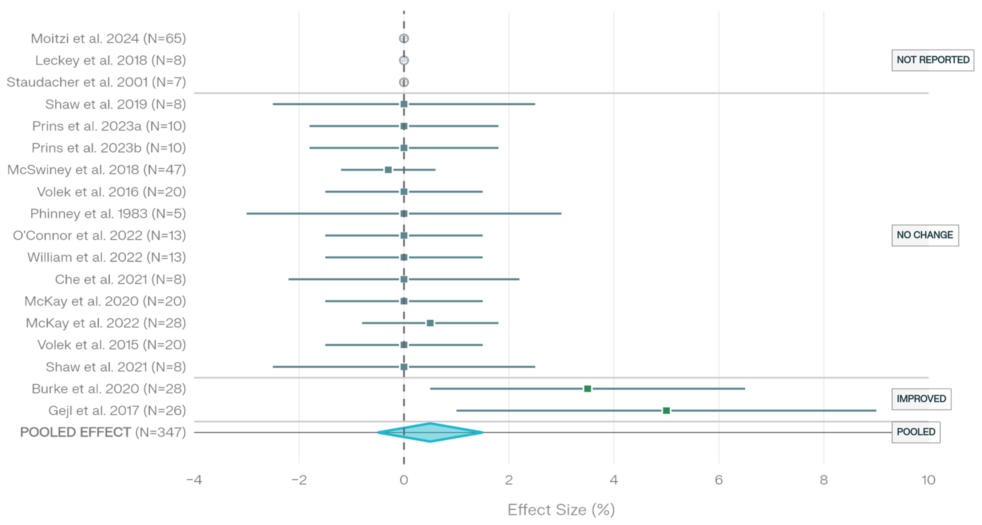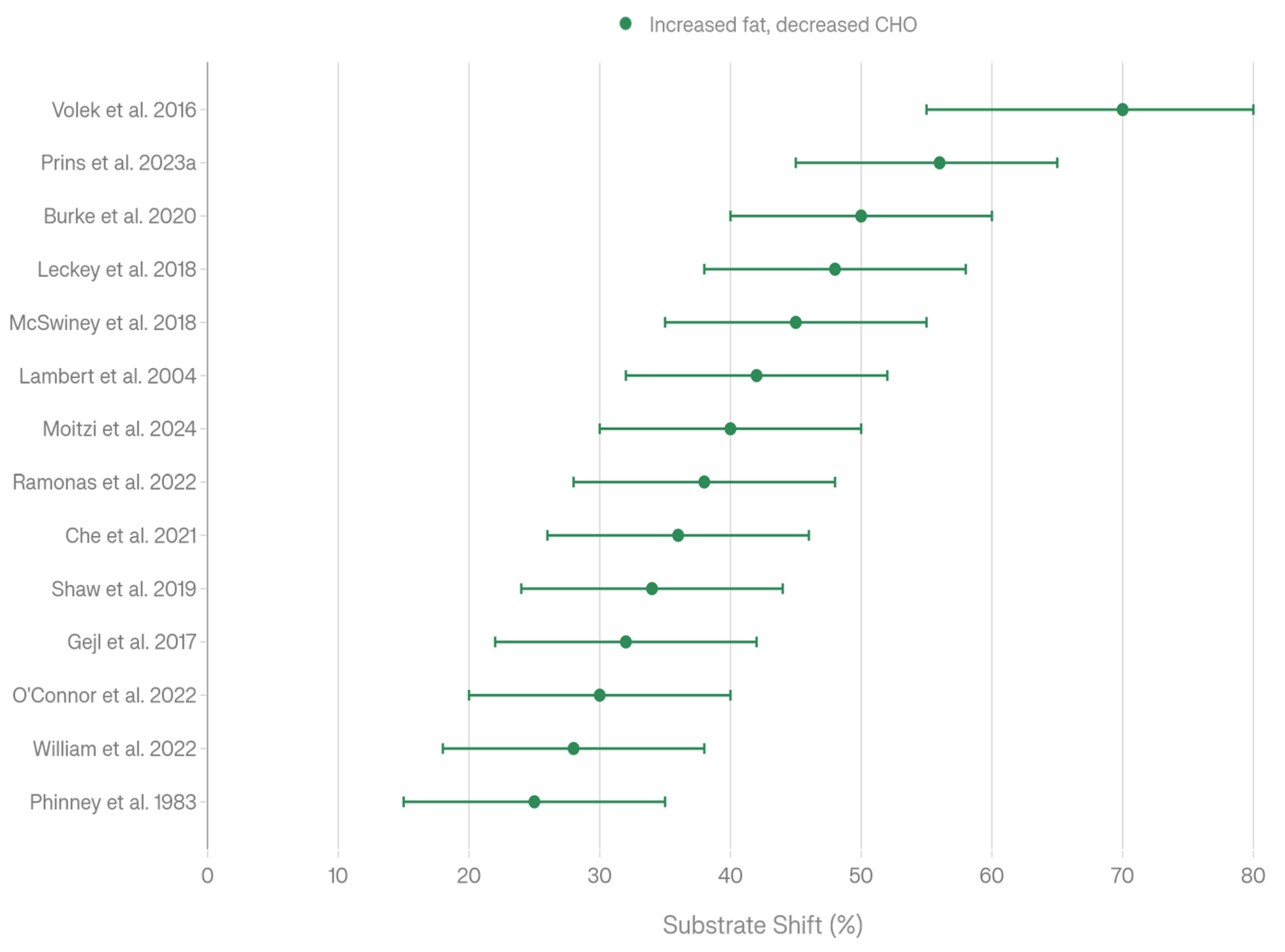Fat oxidation increases consistently and robustly across all measured conditions. All 30 studies measuring fat oxidation rates documented statistically significant increases ranging from 34% to 2.3-fold higher, with universal directional concordance (18 studies p < 0.001, 4 studies p < 0.01, 3 studies p < 0.05, and 5 studies not reporting explicit p-values). This metabolic universality indicates that fat oxidation enhancement represents a primary and essentially inevitable adaptation to low-carbohydrate availability rather than a variable individual response. Substrate utilization patterns shift dramatically and reciprocally, with fat oxidation becoming 56% of total oxidized substrate in low-carbohydrate conditions versus 28–44% carbohydrate oxidation in high-carbohydrate conditions. This fundamental metabolic reorganization is achieved through sustained dietary adherence without requiring co-interventions or supplements, indicating that metabolic flexibility is an inherent capacity of trained muscle that becomes engaged in response to substrate availability. All 14 studies examining substrate utilization patterns (100%) documented consistent increases in fat oxidation coupled with decreases in carbohydrate oxidation.