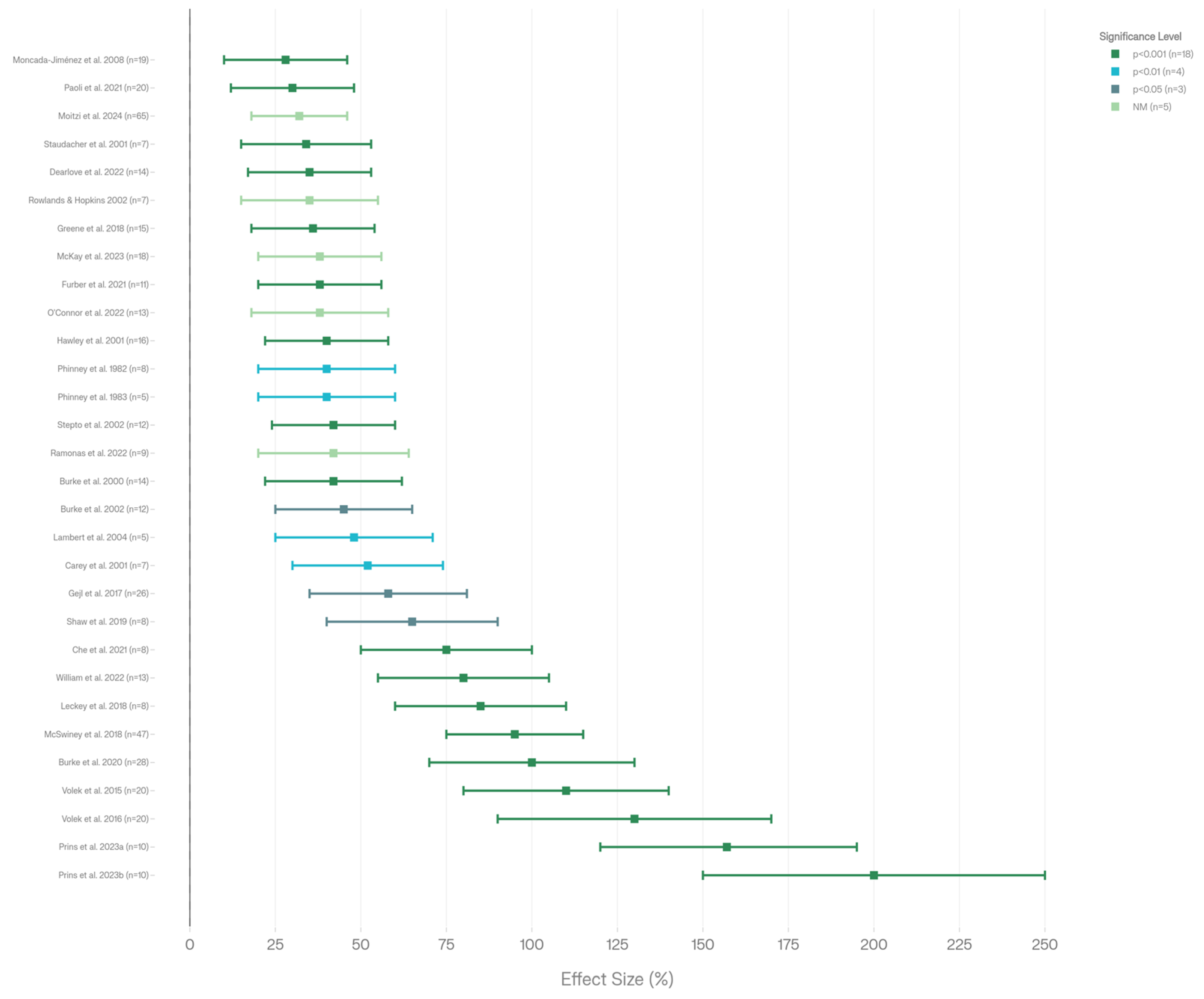 The universal increase in fat oxidation across all 30 studies (100% showing increased rates, all directionally concordant, 18 studies reporting p < 0.001, 4 studies p < 0.01, and 3 studies p < 0.05, 5 studies not reporting explicit p-values but demonstrating clear directional increases) represents one of the most robust findings in the systematic review. This universality across diverse populations (recreational to elite endurance athletes), intervention durations (3 days to 9–36 months), and measurement methodologies (direct fat oxidation rates, respiratory quotient changes, Fatmax determination) indicates that metabolic shift toward fat oxidation is a fundamental and essentially inevitable response to low-carbohydrate dietary availability. The magnitude of shift varies considerably (ranging from 34% to a 2.3-fold increase), but directional consistency across all 30 investigations suggests this represents a primary adaptation rather than a variable individual response.
