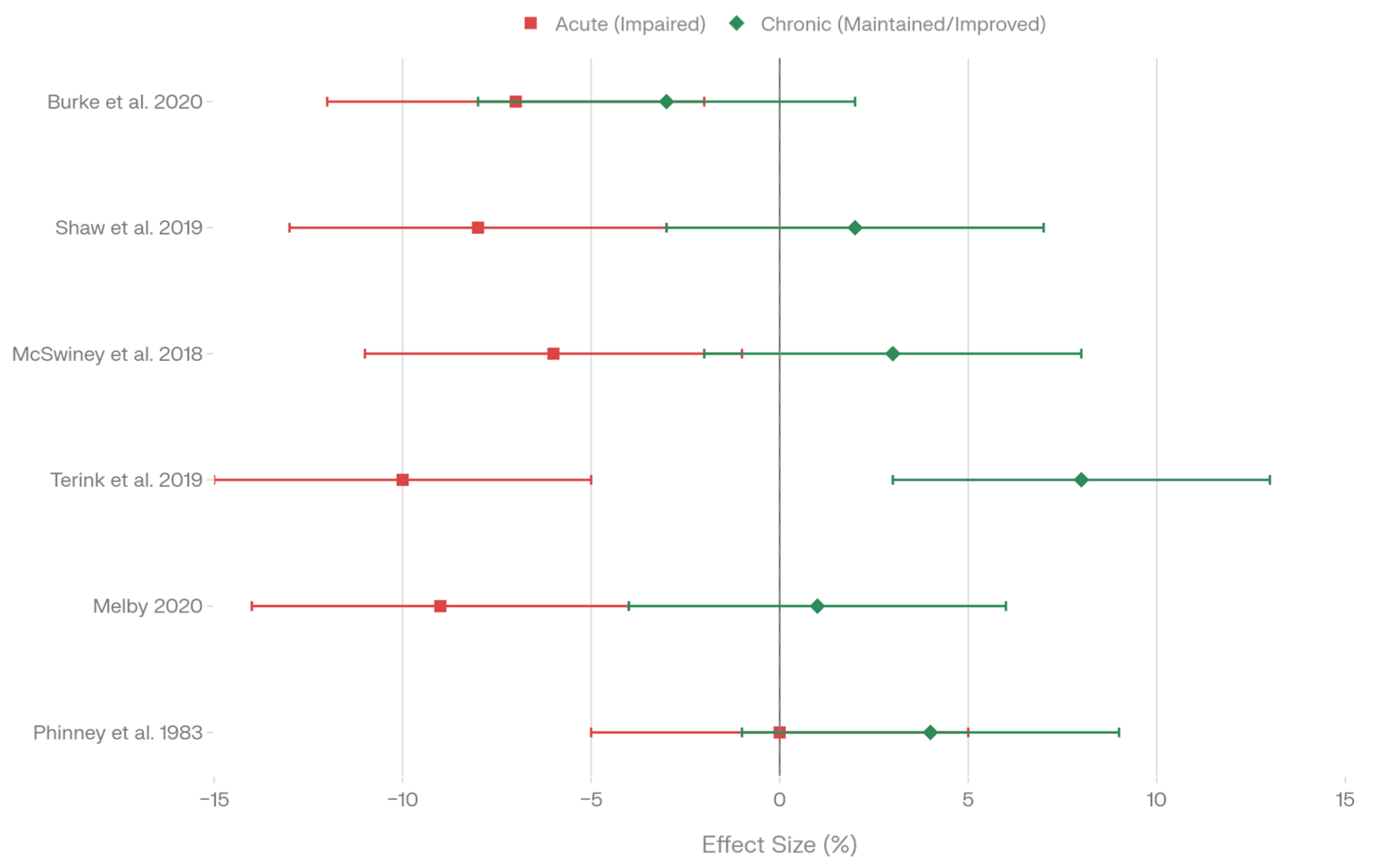 Fourth, the temporal analysis identified that studies measuring performance outcomes solely during acute phases (≤7 days) systematically underestimate trained athlete capacity to adapt to low-carbohydrate conditions by capturing maximum performance impairment before compensatory mechanisms engage (5/6 acute studies showing impairment). Conversely, studies measuring only chronic-phase endpoints (≥4 weeks) may overestimate benefits by missing initial adaptation costs. Future research incorporating explicitly timed measurements at baseline, acute (1–7 days), early chronic (8–14 days), and mid-chronic (4–8 weeks) phases would enable more refined estimation of individual adaptation phenotypes and recovery trajectories.