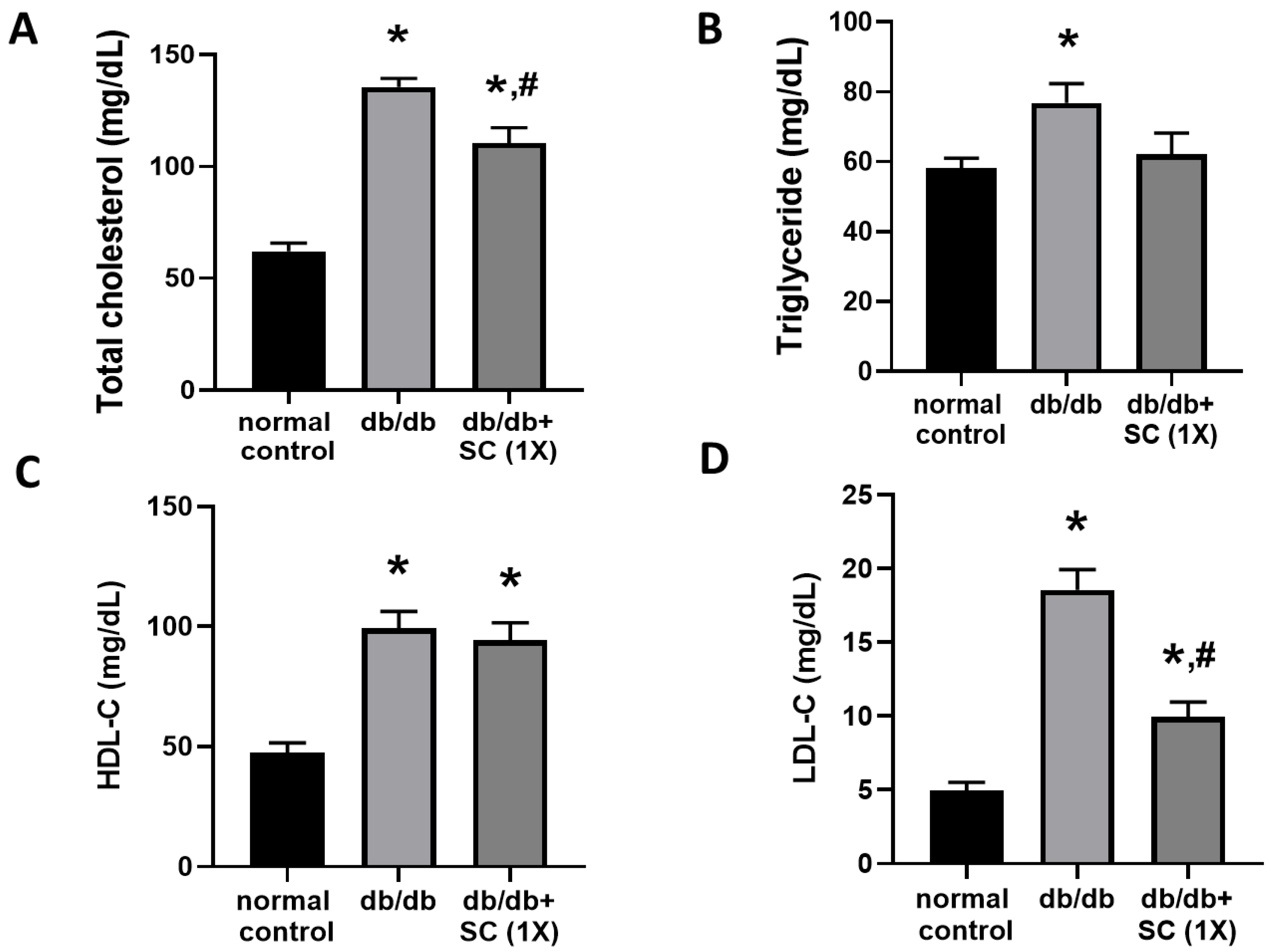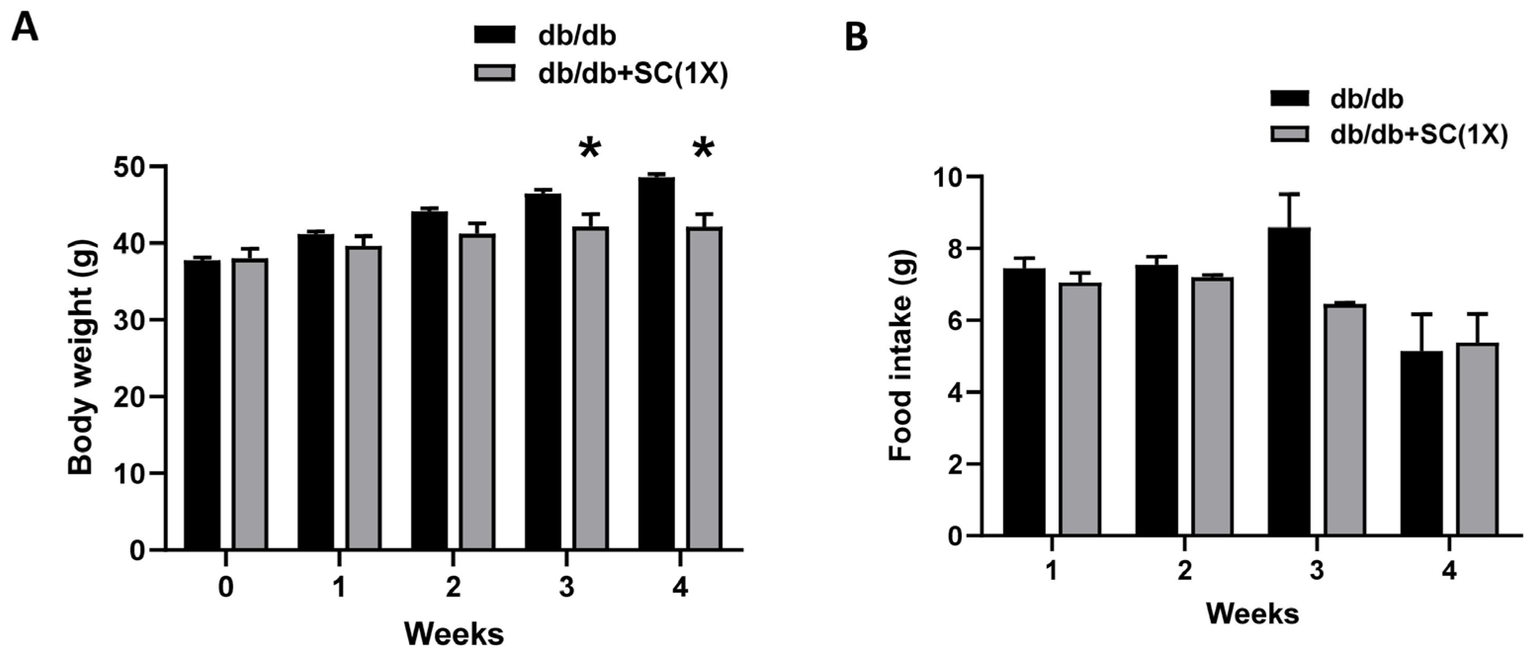 - The db/db diabetic mouse (Leprdb) model. It is a well-established genetic model of T2DM characterized by severe obesity resulting from a loss-of-function mutation in the leptin receptor gene (Lepr); disruption of this signaling pathway prevents normal appetite regulation, leading to hyperphagia, marked obesity, hyperglycemia, impaired glucose tolerance, and hyperinsulinemia, which are hallmark features of T2DM. Six-week-old male db/db mice (purchased from The Jackson Laboratory, Bar Harbor, ME, USA) were randomly assigned to two groups (n = 8 per group): a diabetic control group (untreated db/db mice) and a diabetic treatment group receiving the test product SC at dose of 820 mg/kg body weight. Age-matched six-week-old male C57BL/6 mice (specific pathogen-free; obtained from the Laboratory Animal Center, College of Medicine, National Taiwan University) were used as the normal control group.