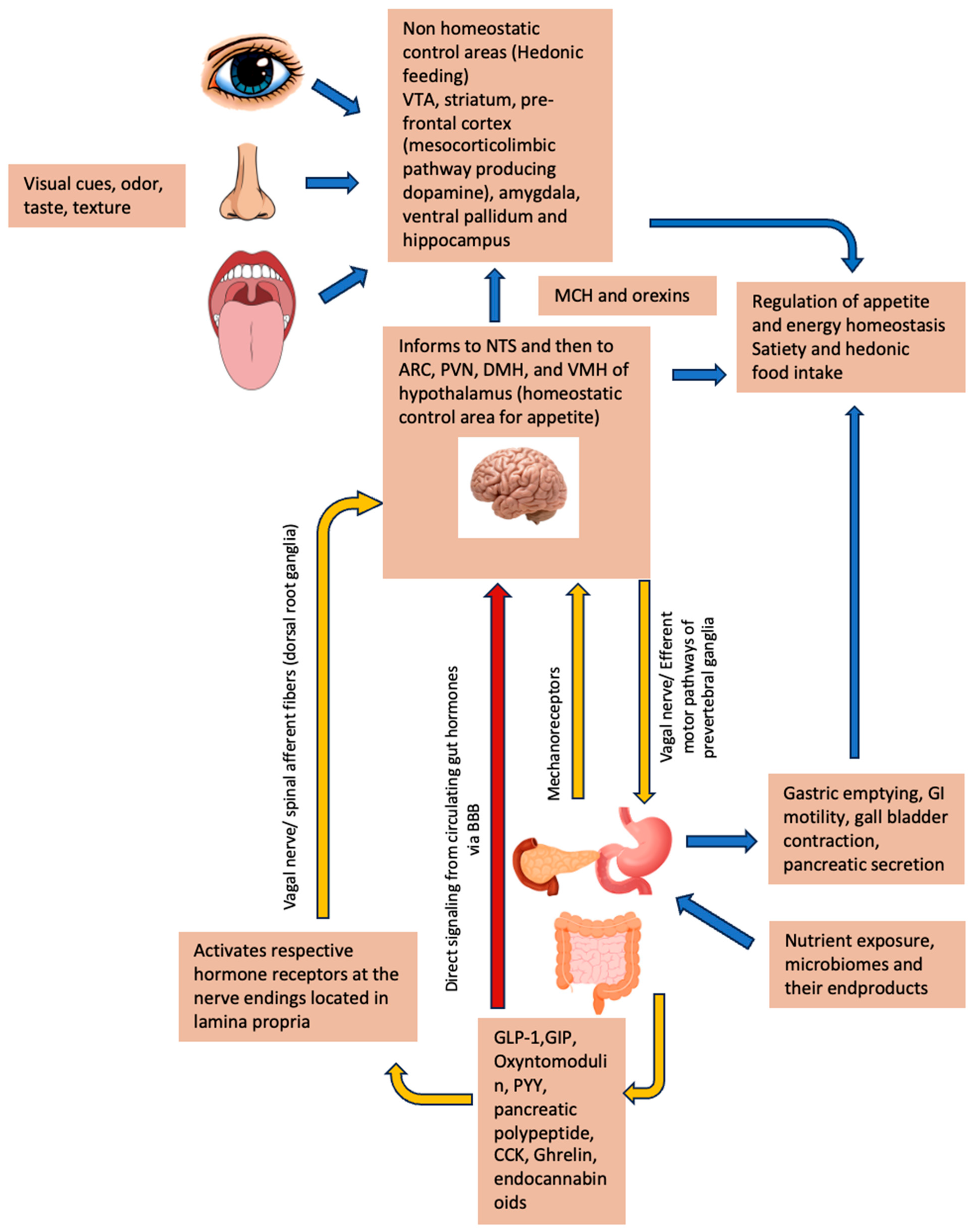- Nogueiras, R. MECHANISMS IN ENDOCRINOLOGY: The gut–brain axis: Regulating energy balance independent of food intake. Eur. J. Endocrinol. 2021, 185, R75–R91. [Google Scholar] [CrossRef]