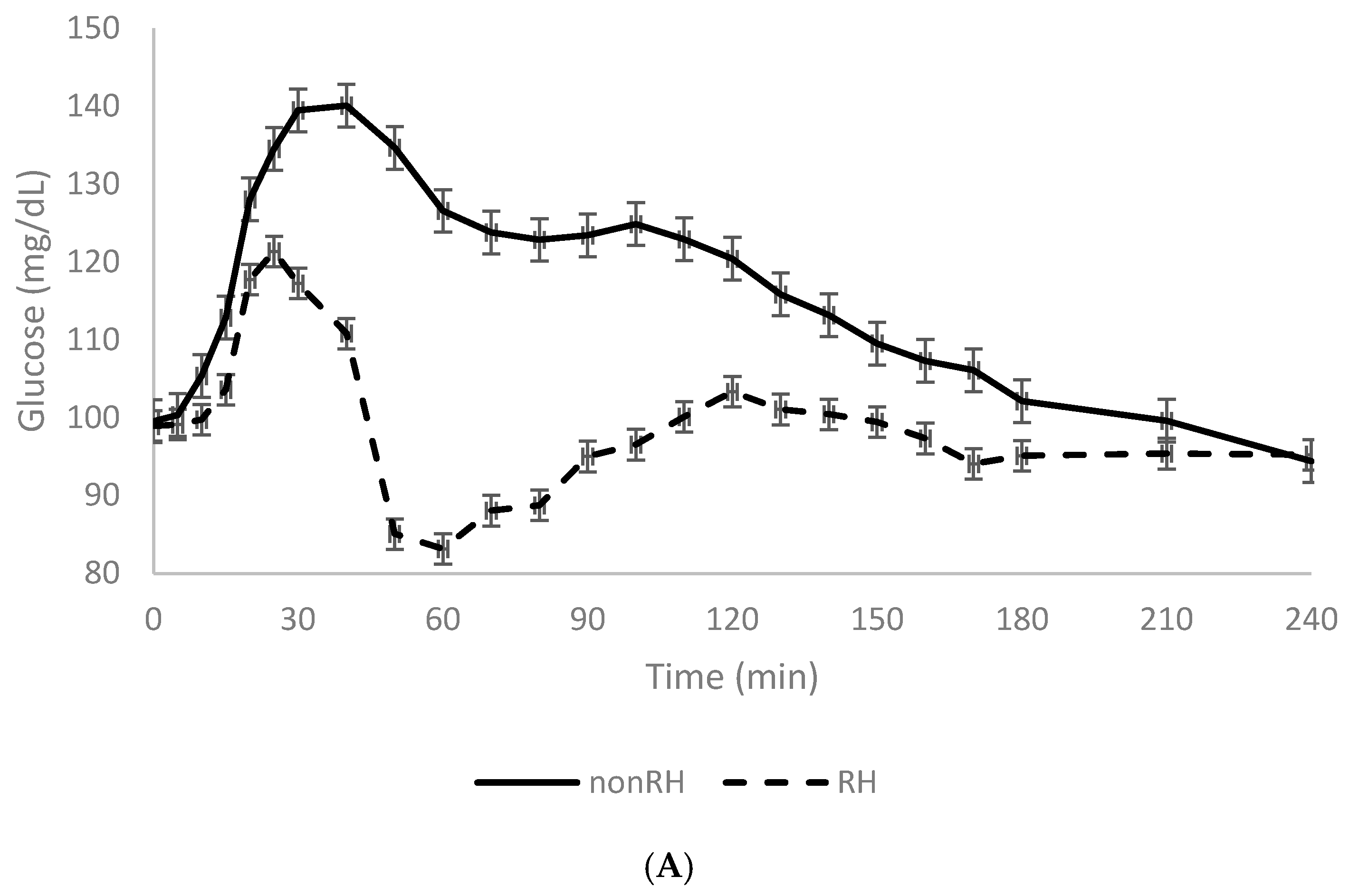 26]. In this study, we did not detect greater hunger in the RH vs. non-RH group, despite the RH group having lower glucose. However, our sample size in the RH group was small, which may have limited our ability to detect a between-group difference. Further research is needed to determine if there is a relationship between RH and hunger/fullness, and whether consuming meals lower in carbohydrates and higher in fat may mitigate the decline in glucose displayed by RH.