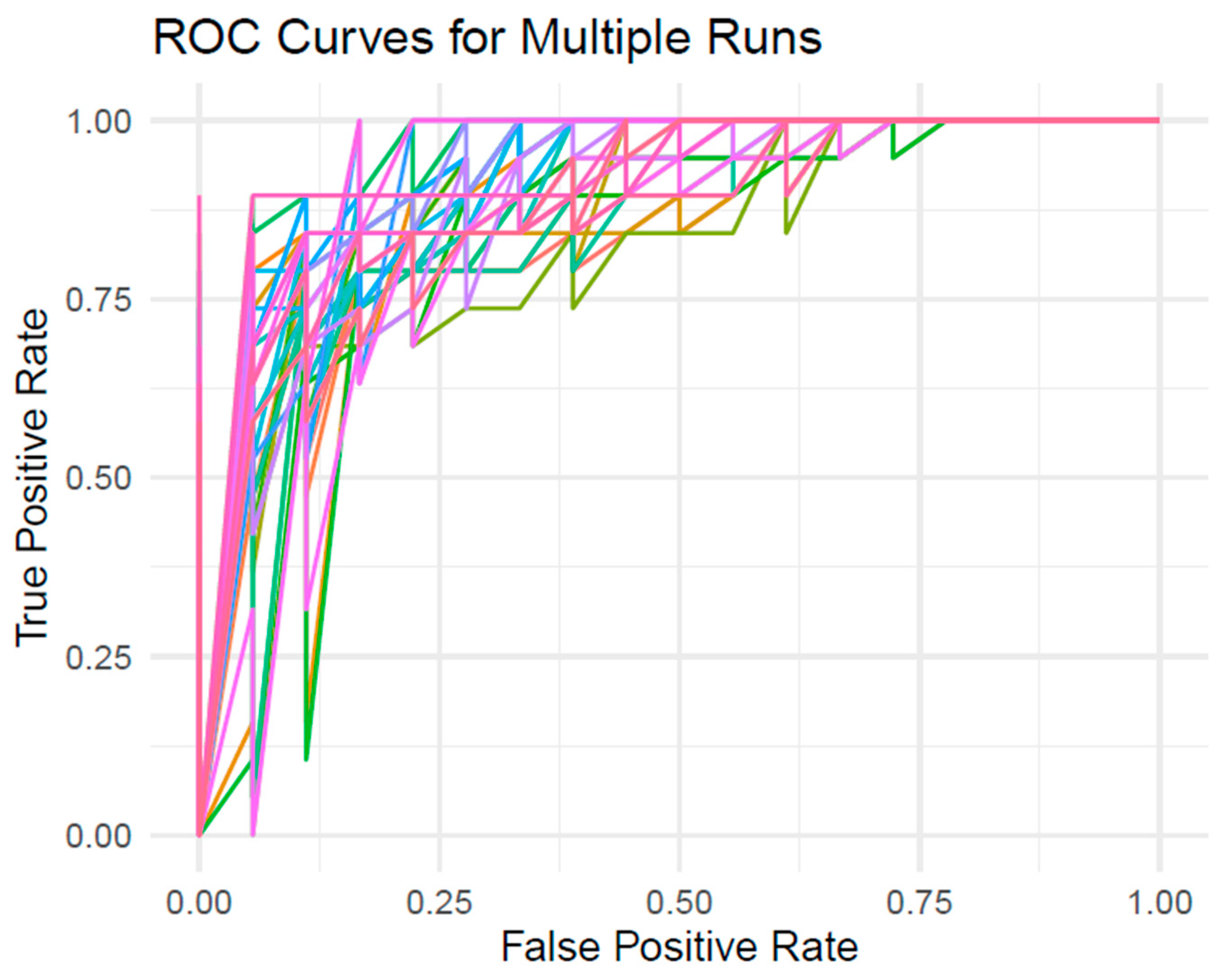 For each logistic regression model, we calculated model coefficients, statistical inference metrics, and the model performance metrics of McFadden’s R2, likelihood ratio R2 (R2L), and the Akaike Information Criterion (AIC). The mean and range of AUC values across iterations were reported for each model to capture variability in predictive performance.